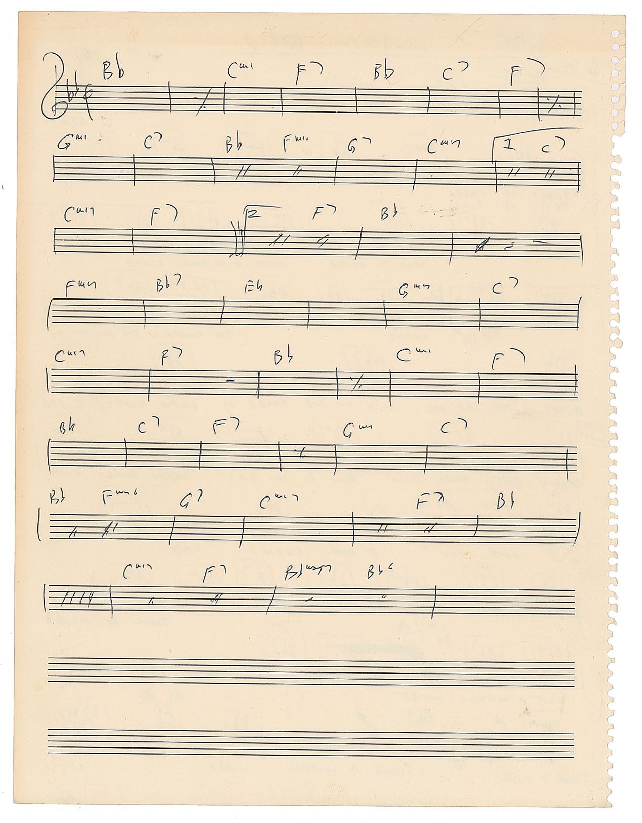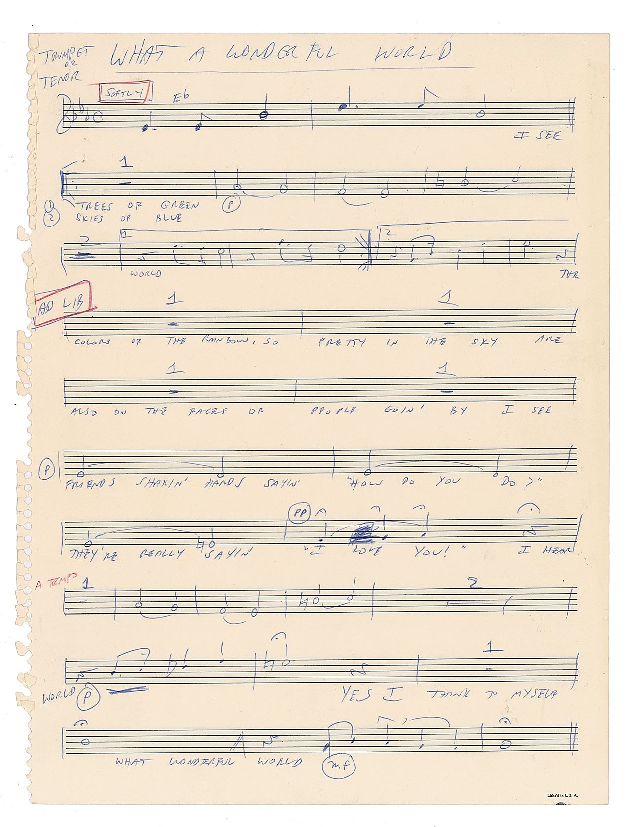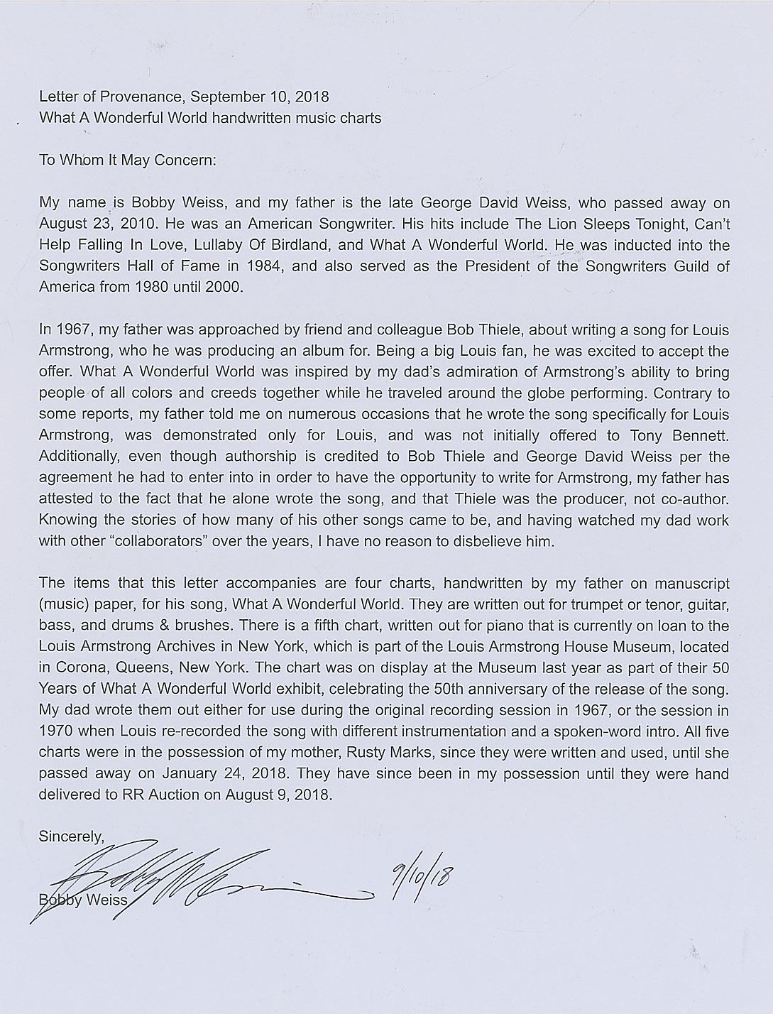 Accompanied by a letter of provenance from the son of George David Weiss, in part: "In 1967, my father was approached by friend and colleague Bob Thiele, about writing a song for Louis Armstrong, who he was producing an album for. Being a big Louis fan, he was excited to accept the offer. What A Wonderful World was inspired by my dad's admiration of Armstrong's ability to bring people of all colors and creeds together while he traveled around the globe performing. Contrary to some reports, my father told me on numerous occasions that he wrote the song specifically for Louis Armstrong, was demonstrated only for Louis, and was not initially offered to Tony Bennett. Additionally, even though authorship is credited to Bob Thiele and George David Weiss per the agreement he had to enter into in order to have the opportunity to write for Armstrong, my father has attested to the fact that he alone wrote the song, and that Thiele was the producer, not co-author…The items that this letter accompanies are four charts, handwritten by my father on manuscript (music) paper, for his song, What A Wonderful World…There is a fifth chart, written out for piano that is currently on loan to the Louis Armstrong Archives in New York, which is part of the Louis Armstrong House Museum, located in Corona, Queens, New York. The chart was on display at the Museum last year as part of their 50 Years of What A Wonderful World exhibit…My dad wrote them out either for use during the original recording session in 1967, or the session in 1970 when Louis re-recorded the song with different instrumentation and a spoken-word intro."