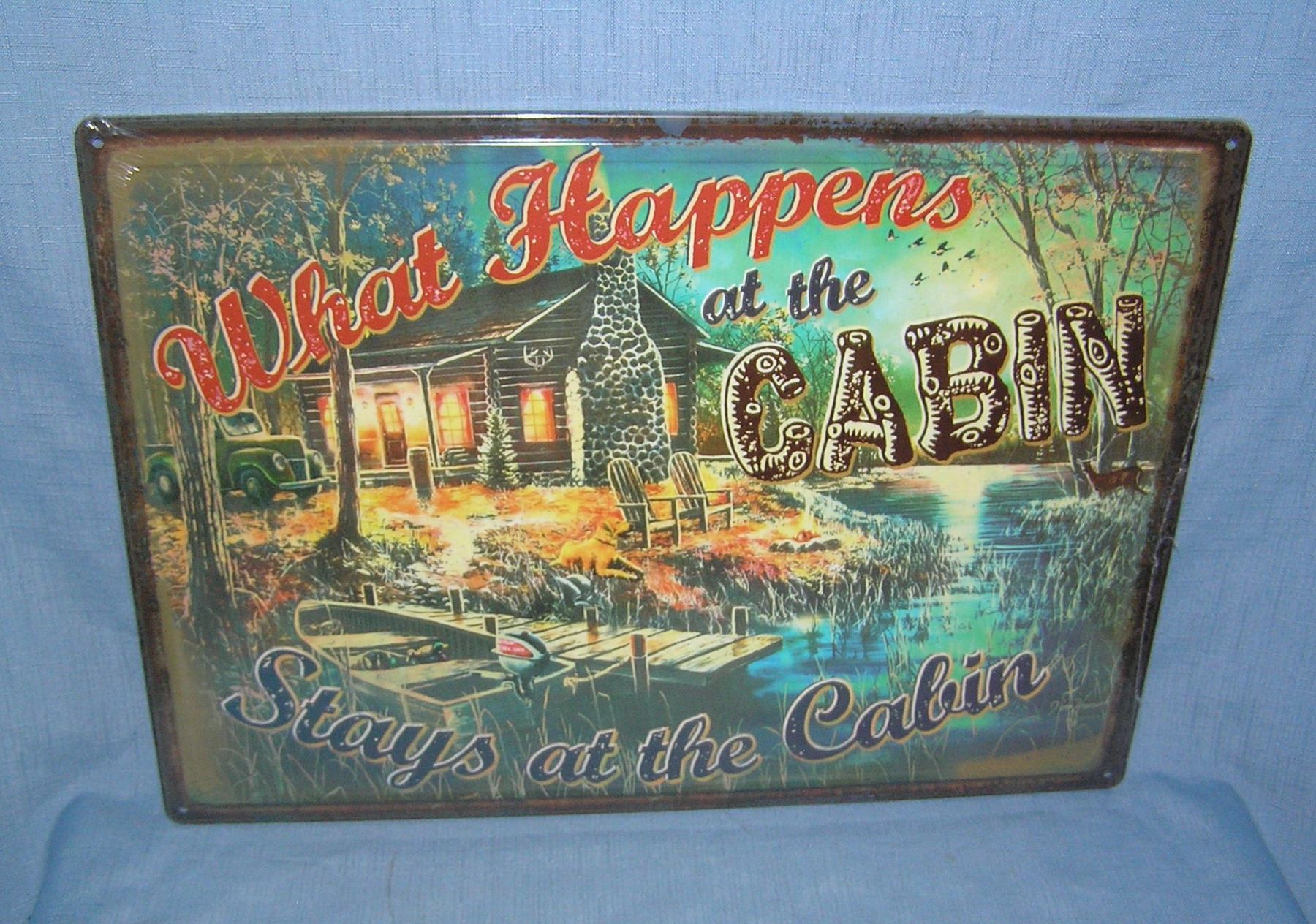 What happens at the cabin stays at the cabin all tin advertising sign est.value $50.00-$60.00