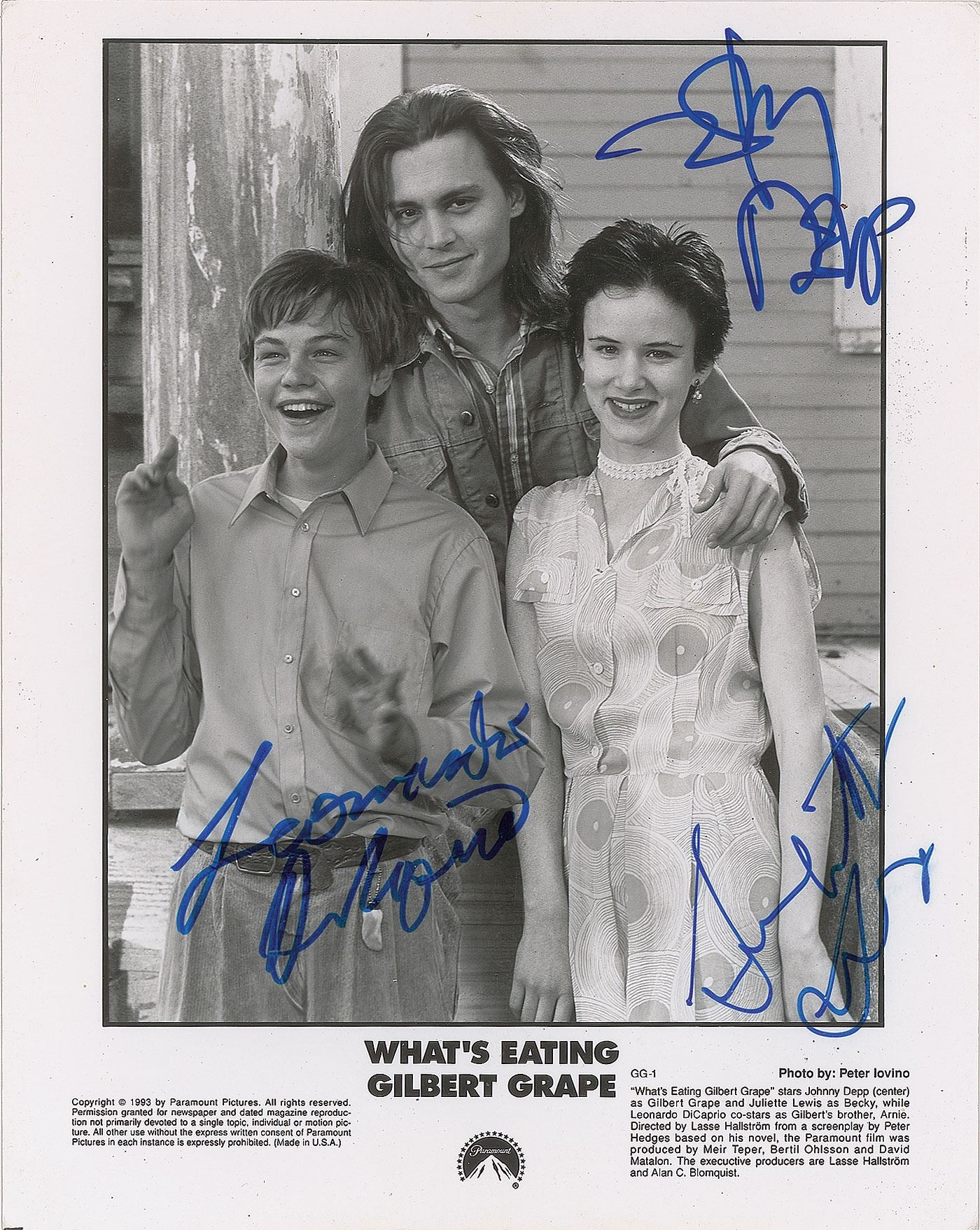 Glossy 8 x 10 Paramount Pictures publicity photo for the 1993 film What's Eating Gilbert Grape, signed in blue felt tip by Leonardo DiCaprio, Johnny Depp, and Juliette Lewis. In very good to fine condition, with a horizontal bend across the image. DiCaprio received his first Academy Award nomination for his role as Arnie Grape.