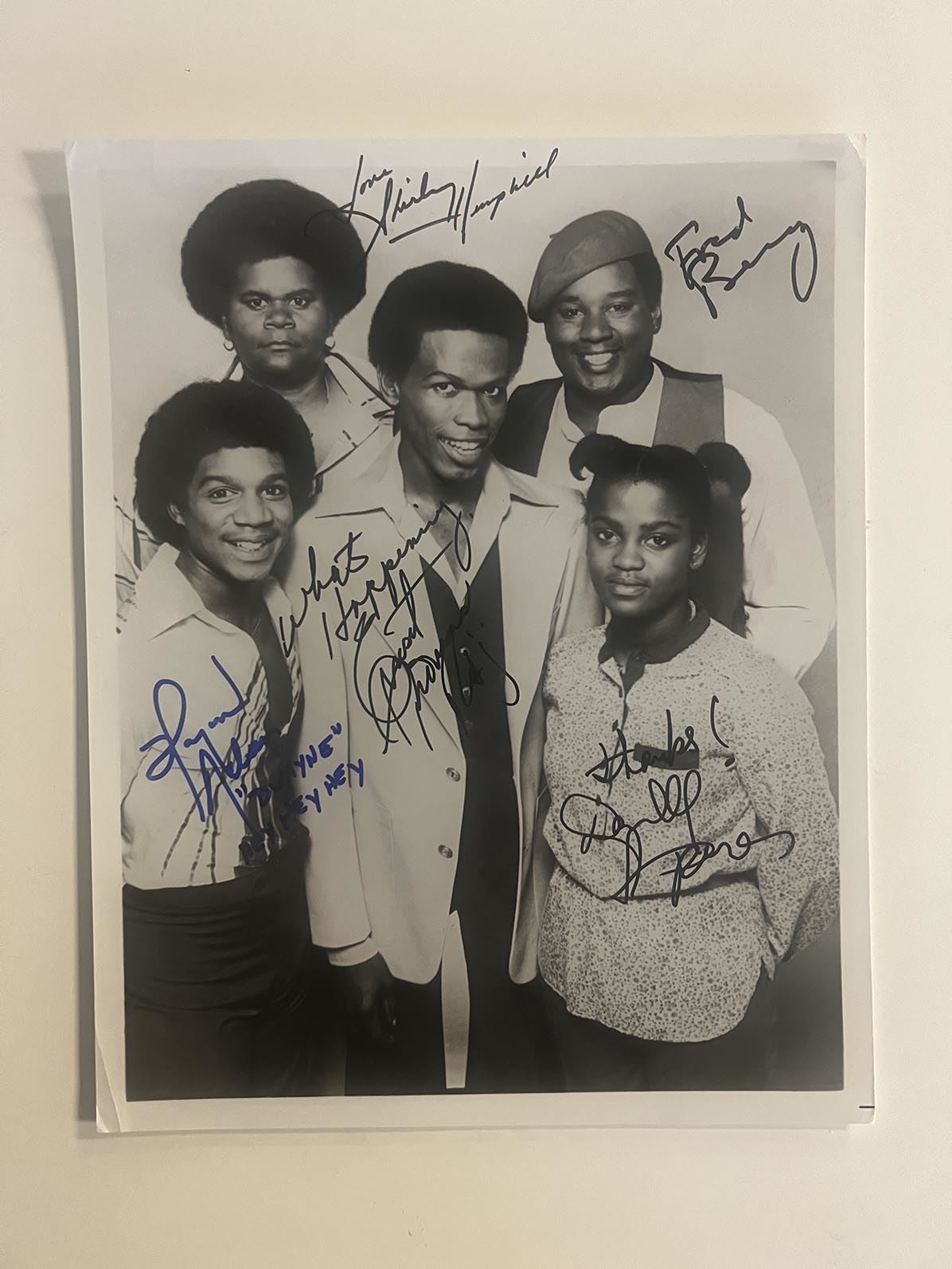 What's Happening! cast signed photo autographed by Ernest Lee Thomas, Haywood Nelson, Fred Berry, Danielle Spencer, and Shirley Hemphill. 8x10 inches