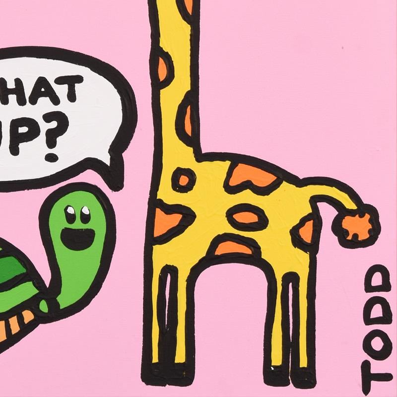 "What's Up" is an original acrylic painting on gallery wrapped canvas by Todd Goldman, hand signed by the artist. Includes Letter of Authenticity. Measures approx. 24" x 36" (image). Due to the way this piece was stored there may be minor wear or signs of age (such as wear on the corners) but the piece is in overall good condition.