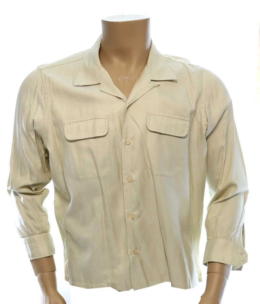 What's the Worst That Could Happen (2001) - Danny DeVito as Max Fairbanks, production used Anto Beverly Hills beige long-sleeve shirt. Label within dated June 2000 and another with initials DD.
