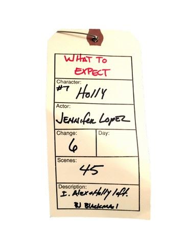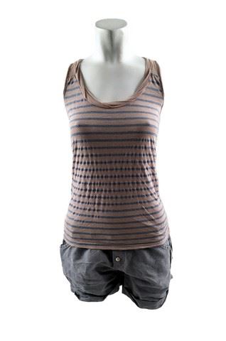 Holly (Jennifer Lopez) screen worn, hero, taupe and baby blue horizontal stripe racer back with mesh at the shoulder blades 'Splendid' tank top, (size S) and blue grey linen with tan elastic waistband three button fly closure with two back patch pockets 'Splendid' shorts. Includes wardrobe tag.