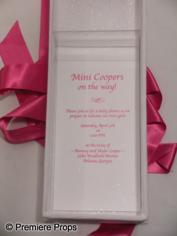 Skyler (Brooklyn Decker) and Ramsey (Dennis Quaid) screen used, hero, Baby Shower invitation in a shiny box with a pink ribbon and the title 'Mini Coopers on the way!' Condition may vary slightly.