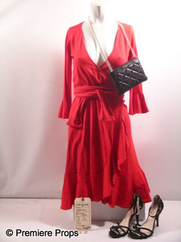 In "What to Expect When You're Expecting" (2012), five couples lives intertwined as they go about the trials and tribulations of "having a baby". One of the main characters is Wendy (Elizabeth Banks) playing a militant mommy whose life changes dramatically. These are her hero screen worn red with self belt 'Isabella Oliver' dress, (size 2) black leather rectangular 'Kate Spade' purse, fake pearl earrings, and shiny black 'Calvin Klein' heels. (size 7) Includes original wardrobe tag,