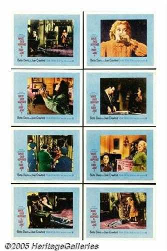 <B>Whatever Happened to Baby Jane (Warner Brothers, 1962).</B></I> Lobby Card Set of 8 (11" X 14"). Robert Aldrich's macabre tale of two washed-up actress sisters is a true camp classic. The tremendous performances by Bette Davis and Joan Crawford were, by all accounts, fueled by their true dislike of each other. There are a few border pinholes on all the cards. Cards #2 and #3 have some border stains and a few light smudge marks. Overall, the set is in fine condition and displays very well. Very Fine-.