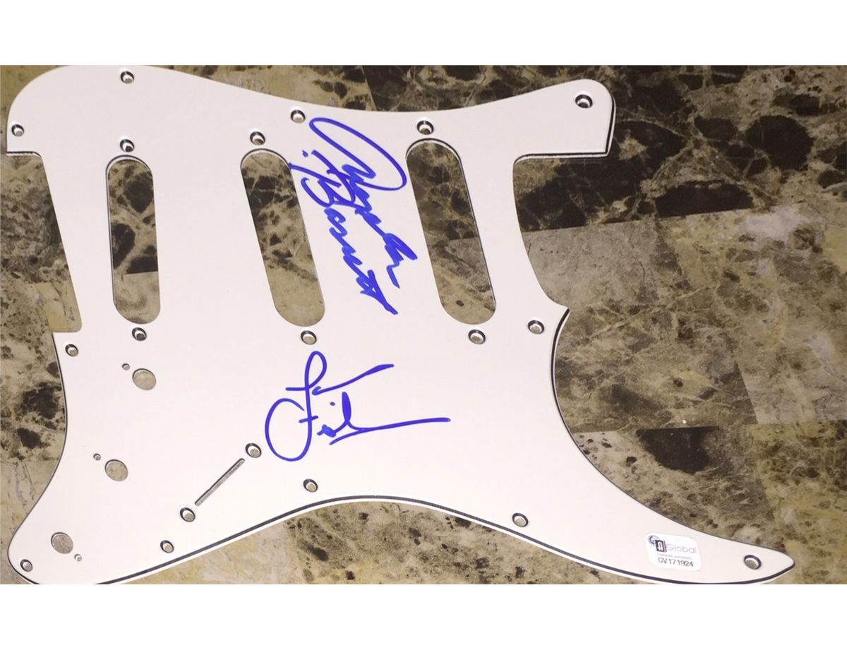 A Fender strat pickguard signed in person by Angela Basset and Lawrence Fishburne the two stars of the Tina Turner bio film with GAI COA