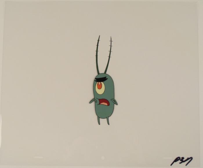 This original animation cel is from the Nickelodeon TV show SpongeBob Squarepants. The story takes place under the deep blue sea in Bikini Bottom, where SpongeBob resides. SpongeBob, who is a yellow, porous sponge, is your typical happy-go-lucky character, as he is always cheerful and enjoys making people laugh. Patrick Star, SpongeBob's neighbor who is a starfish, is your average children's show idiot, as he boasts knowing nothing and is often getting himself into ridiculous situations. Between the homes of these two lies the home of the miserable Squidward, a squid, who is known for being grouchy and playing tricks on SpongeBob and Patrick. Both SpongeBob and Squidward work at the Krusty Krab, a fast food business run by the greedy money-loving Mr. Krabs, a crab, the arch rival of the evil, possibly misunderstood, Plankton. Another neighbor, Sandy Cheeks, an athletic squirrel who normally wears an astronaut's space suit, was introduced in "Tea at the Treedome." She spends most of her time inventing and experimenting. In this cel, Plankton doesn't look too pleased. Original Production Animated Cel Overall Size of Cel: 10 1/2" x 12 1/2" Excellent ConditionThis is an original hand-painted cel set-up used in the production of an episode of "SpongeBob SquarePants." Each one-of-a-kind set-up represents a slight change in position of the characters. When individually photographed and projected in rapid succession, the images appear to move.