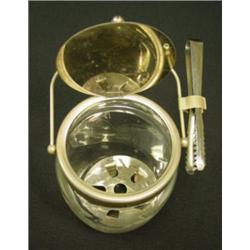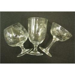 7-pc Honeymoon set: etched glass ice bucket with hinged metal lid/handle, attached tong holder (tongs included) and metal drain insert. Bucket is 9.5" tall and 5" wide. Plus two each sherry, water and wine stems, all pieces in the wheat pattern. Condition: Excellent