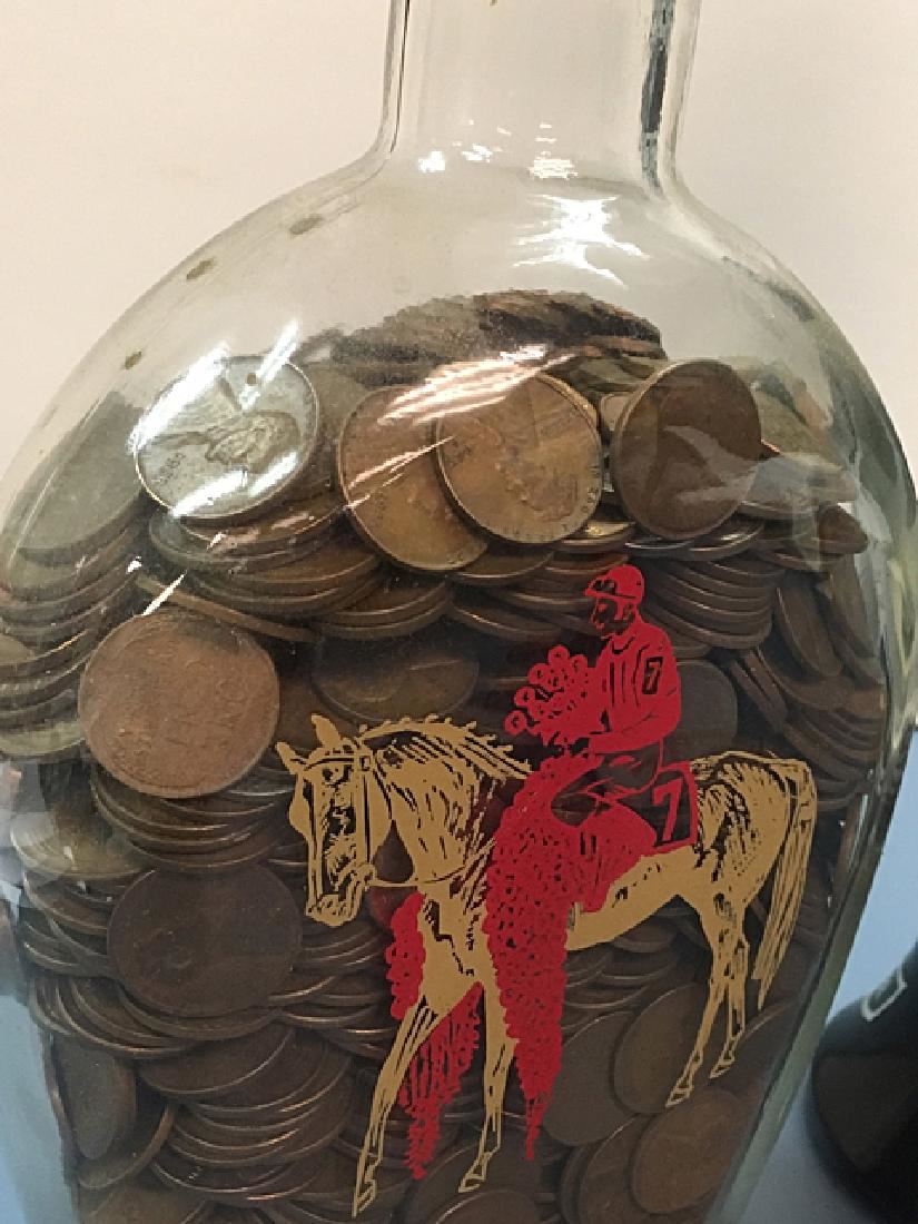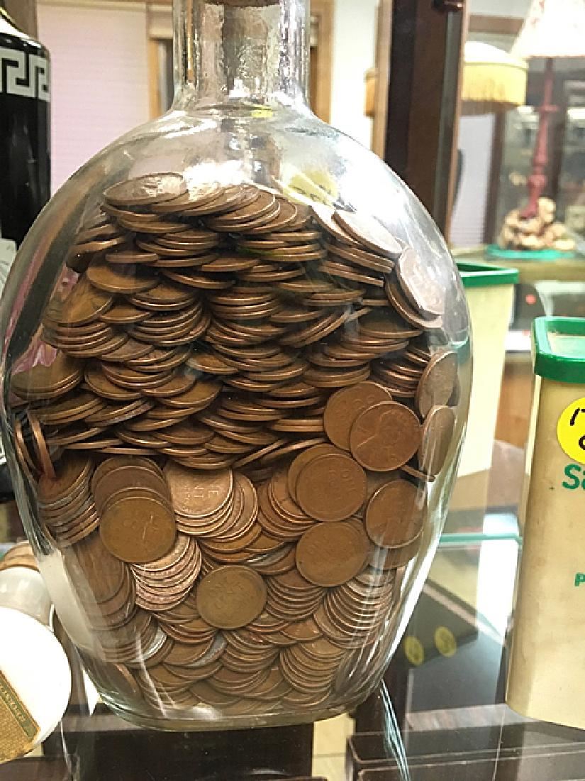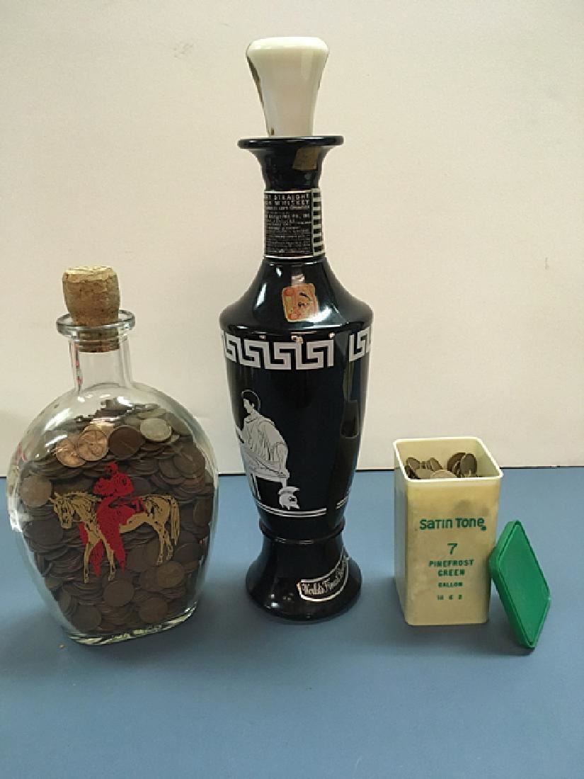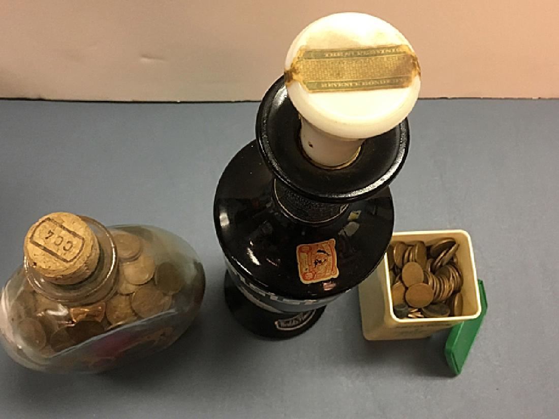 Possibly over 1,000 wheat pennies in vintage decorative bottle, Jim Beam collector's bottle, and vintage advertising box.
