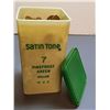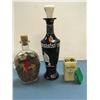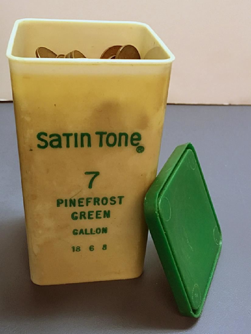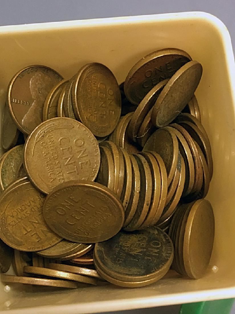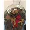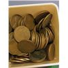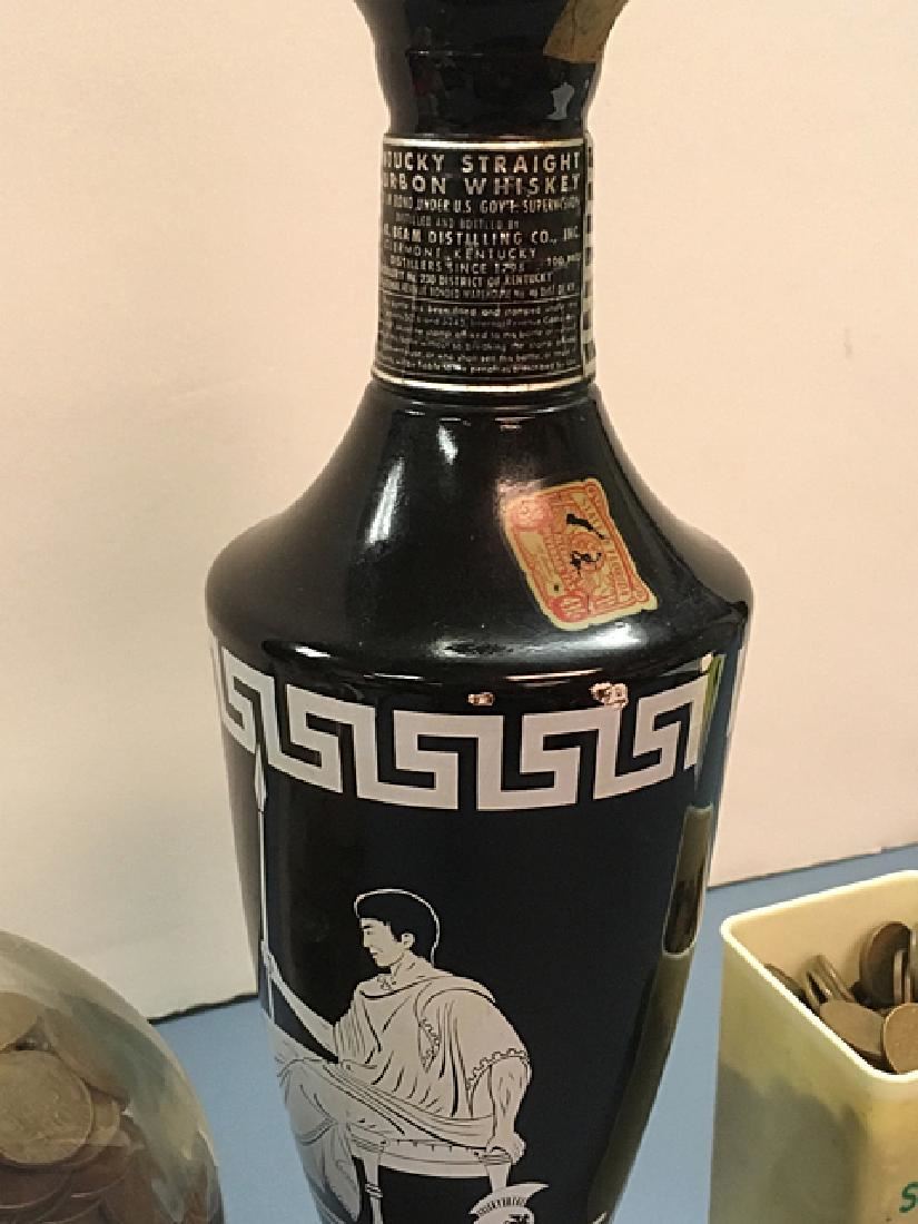 Possibly over 1,000 wheat pennies in vintage decorative bottle, Jim Beam collector's bottle, and vintage advertising box.