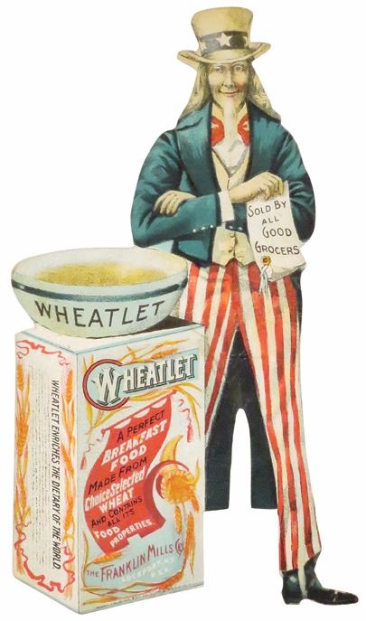 Wheatlet Die Cut Easelback Sign. Beautiful Americana image with Uncle Sam. Couple of tape repairs on back otherwise good condition. 3 3/4 X 6 1/2 inches.