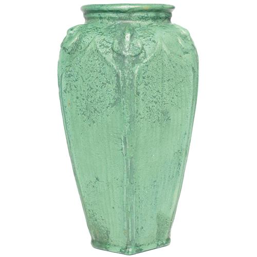 Wheatley vase, large tapered form with applied vertical leaves, stems and flowers covered in a multi-toned green matt glaze, marked, 12.5"h, minor chip repair