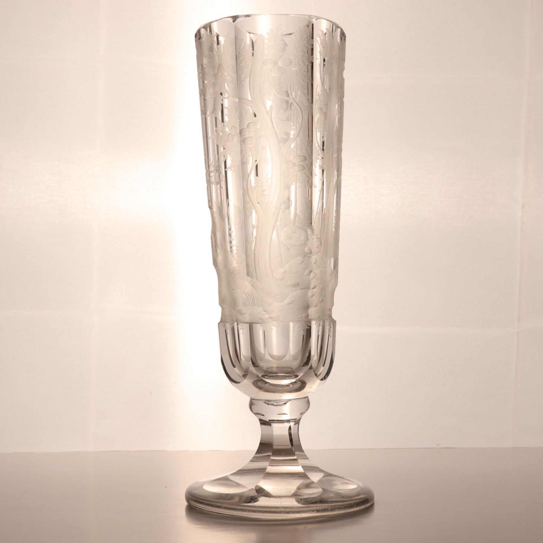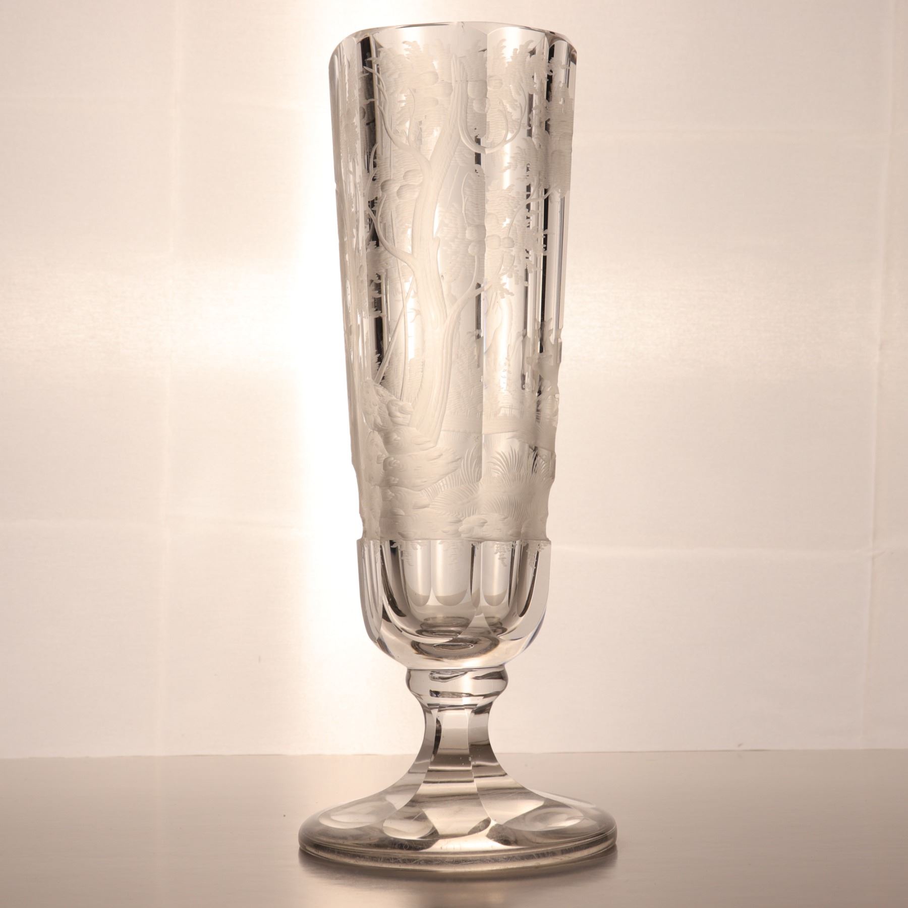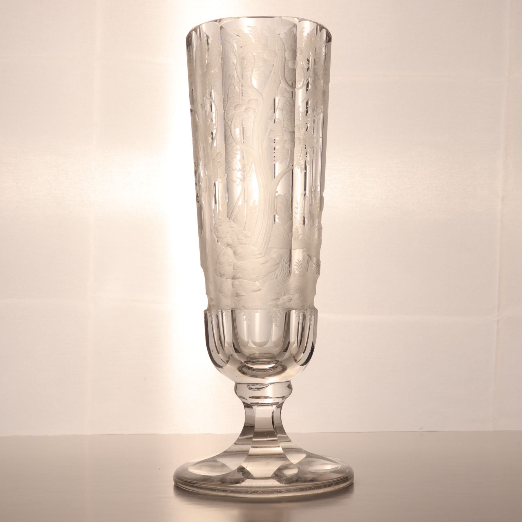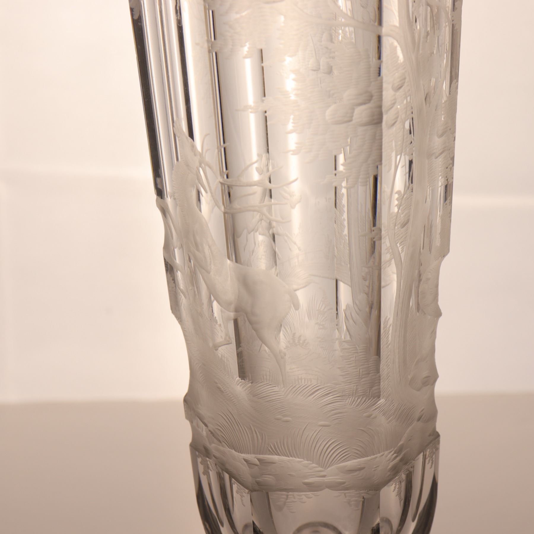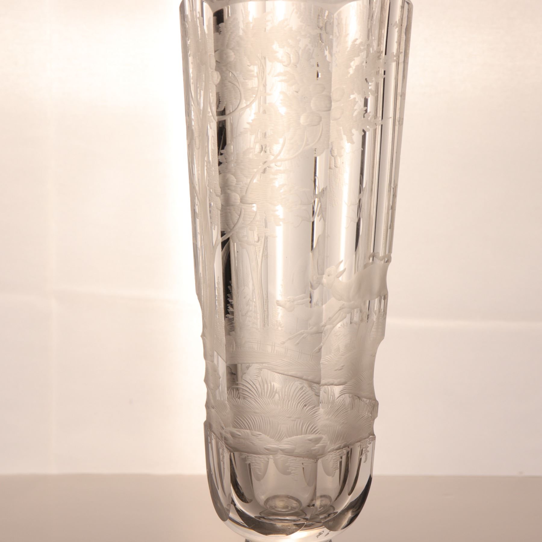 Tall wheel-engraved clear glass vase on a stepped foot, decorated with wild life in landscape. The cylindrical body is panelled and acid-softened in appearance, with the engraved scene wrapping around the vessel. Decorative 20th century art glass, sold as a single display piece. Chip to the rim.