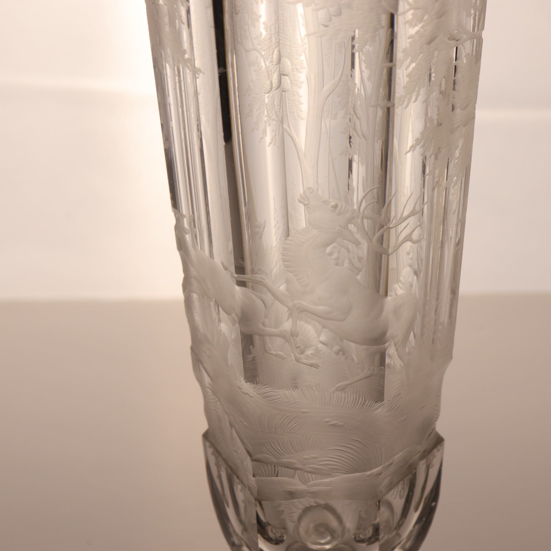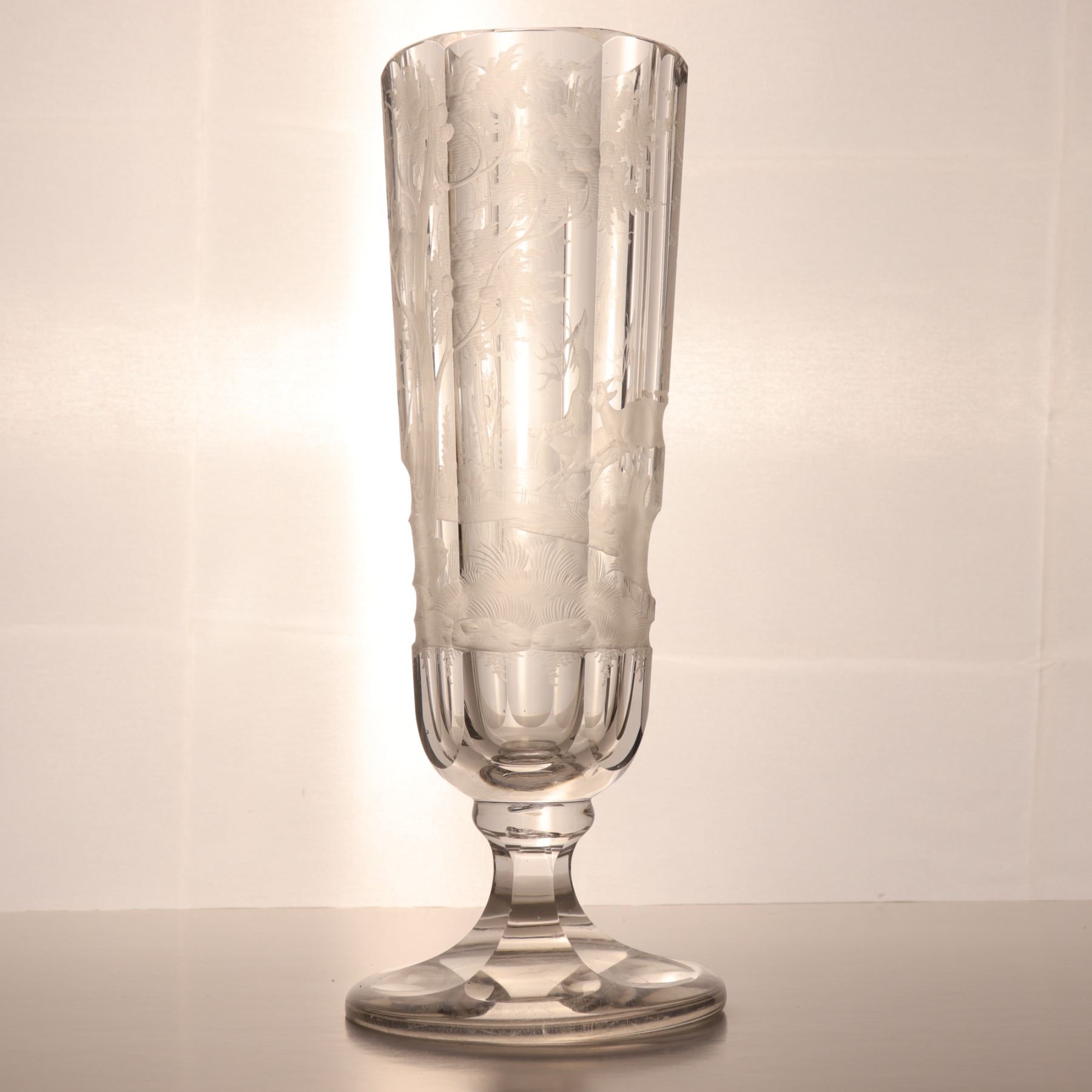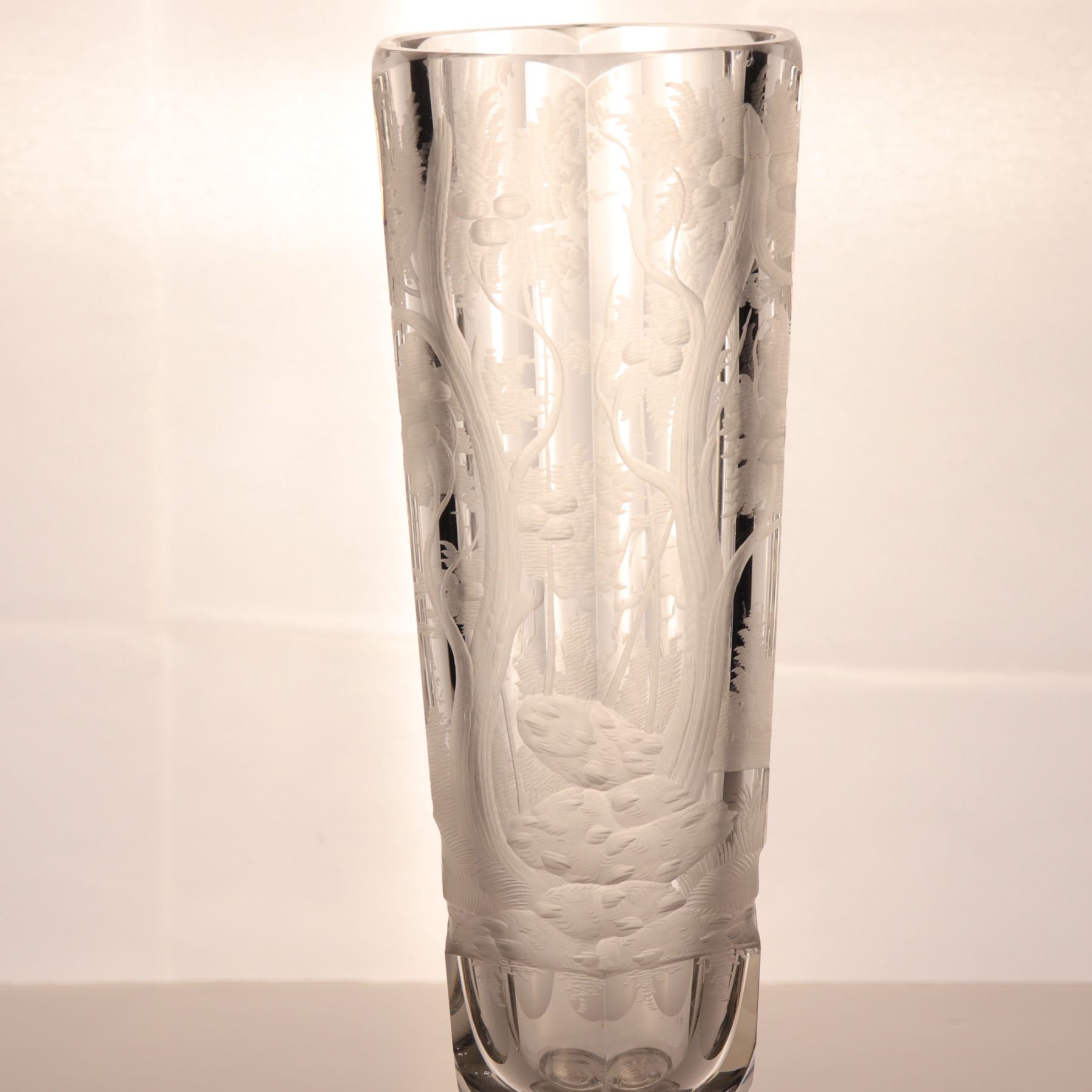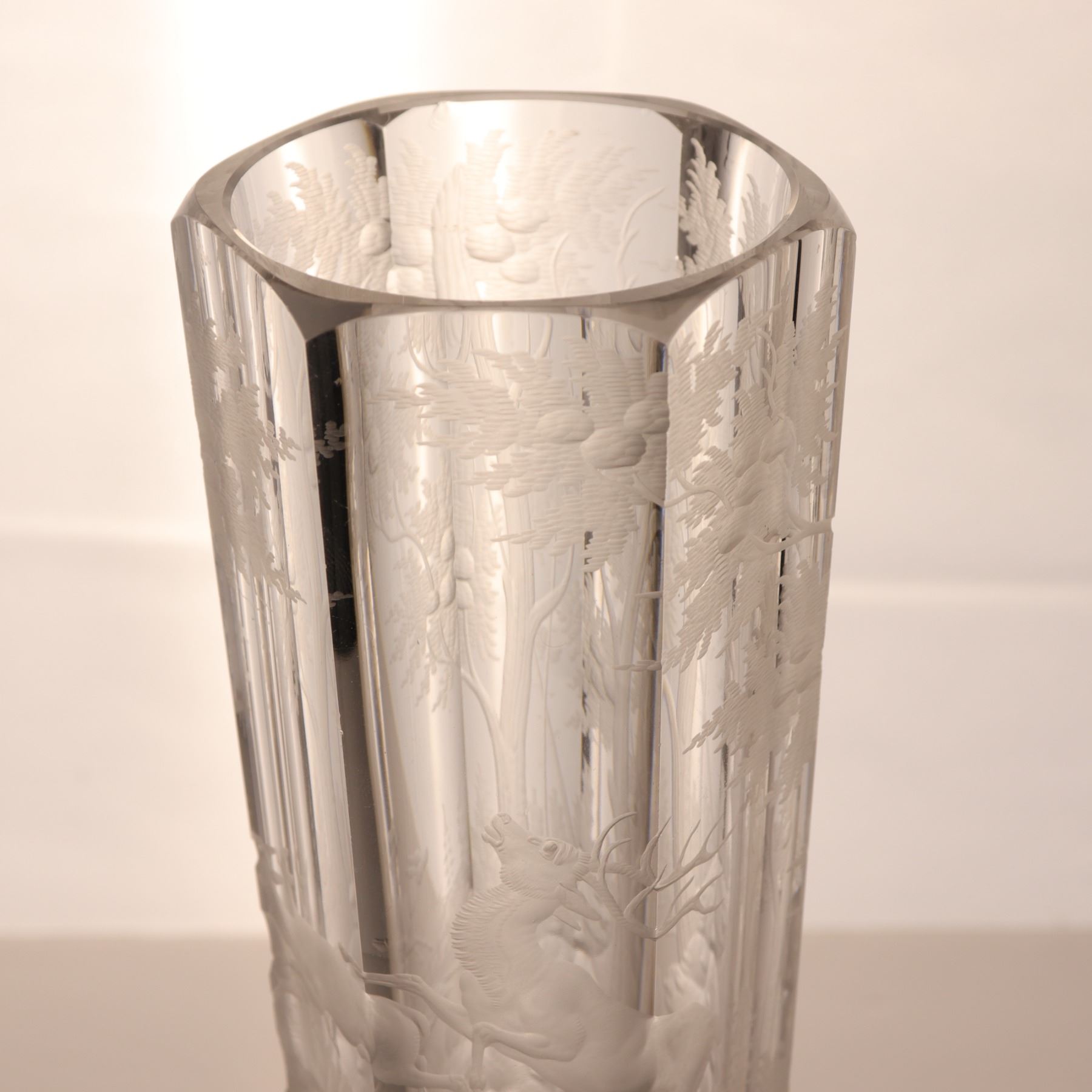 Tall wheel-engraved clear glass vase on a stepped foot, decorated with wild life in landscape. The cylindrical body is panelled and acid-softened in appearance, with the engraved scene wrapping around the vessel. Decorative 20th century art glass, sold as a single display piece. Chip to the rim.