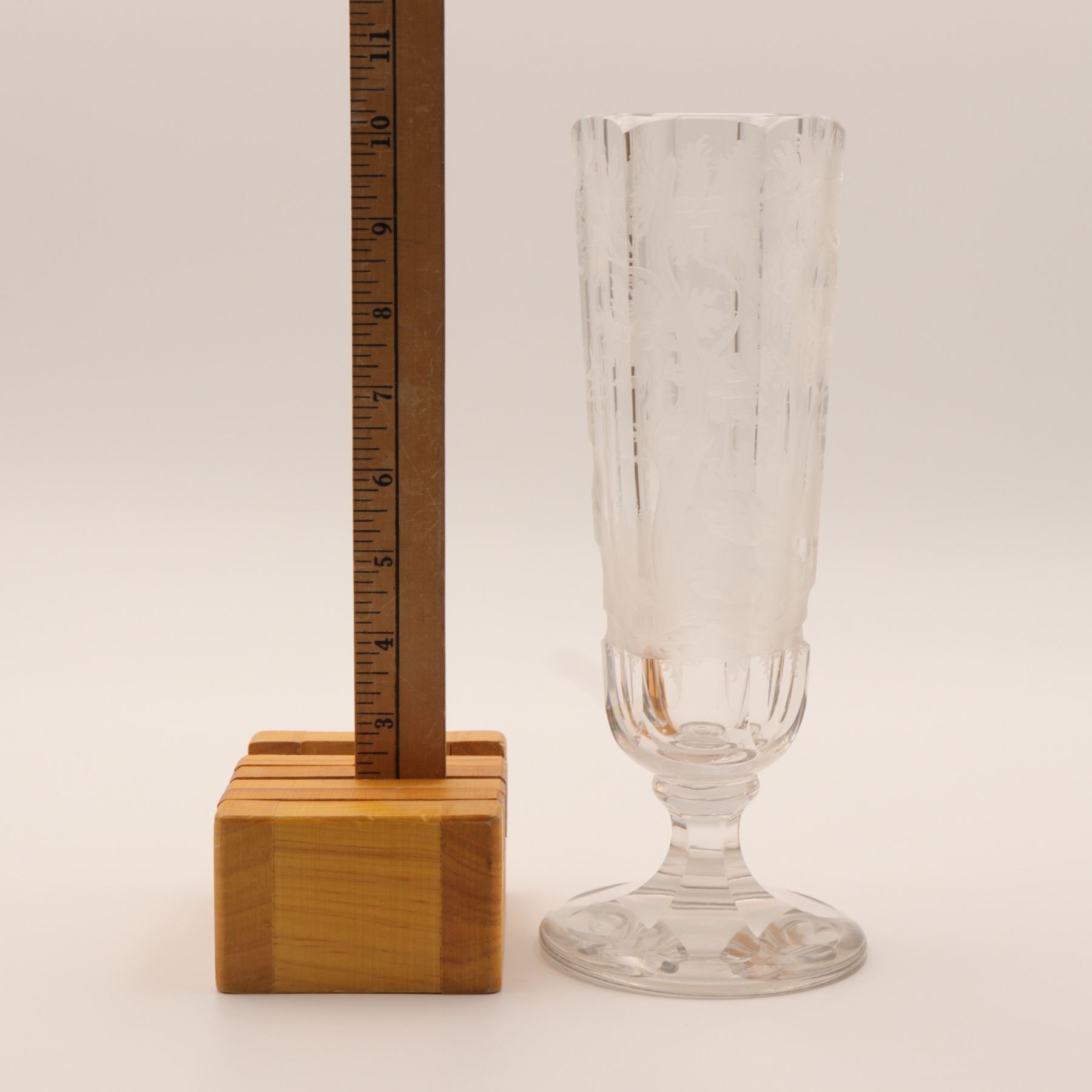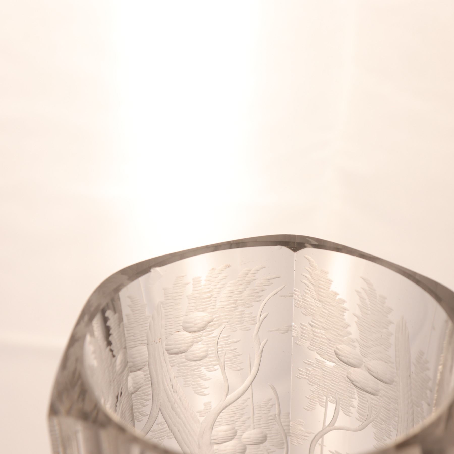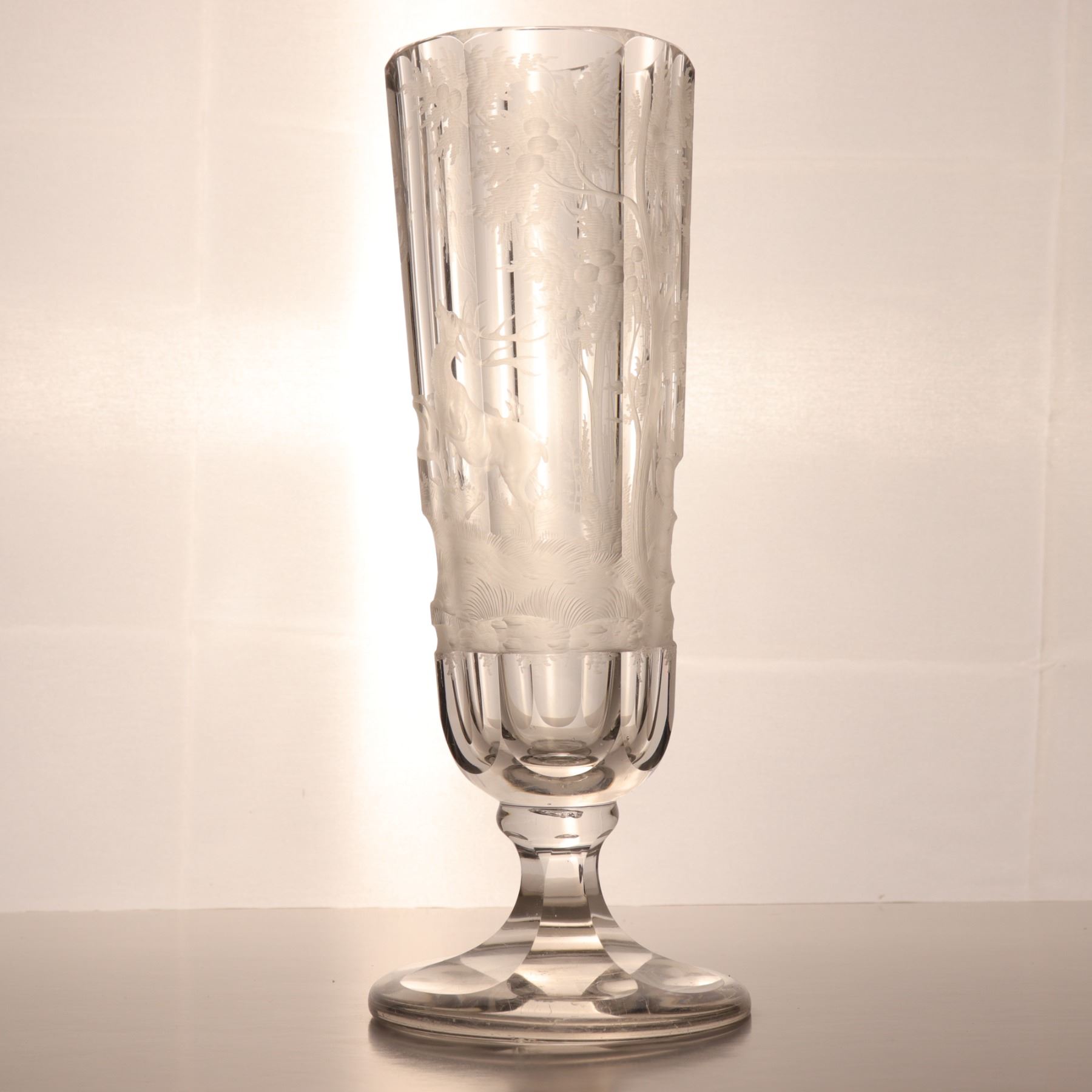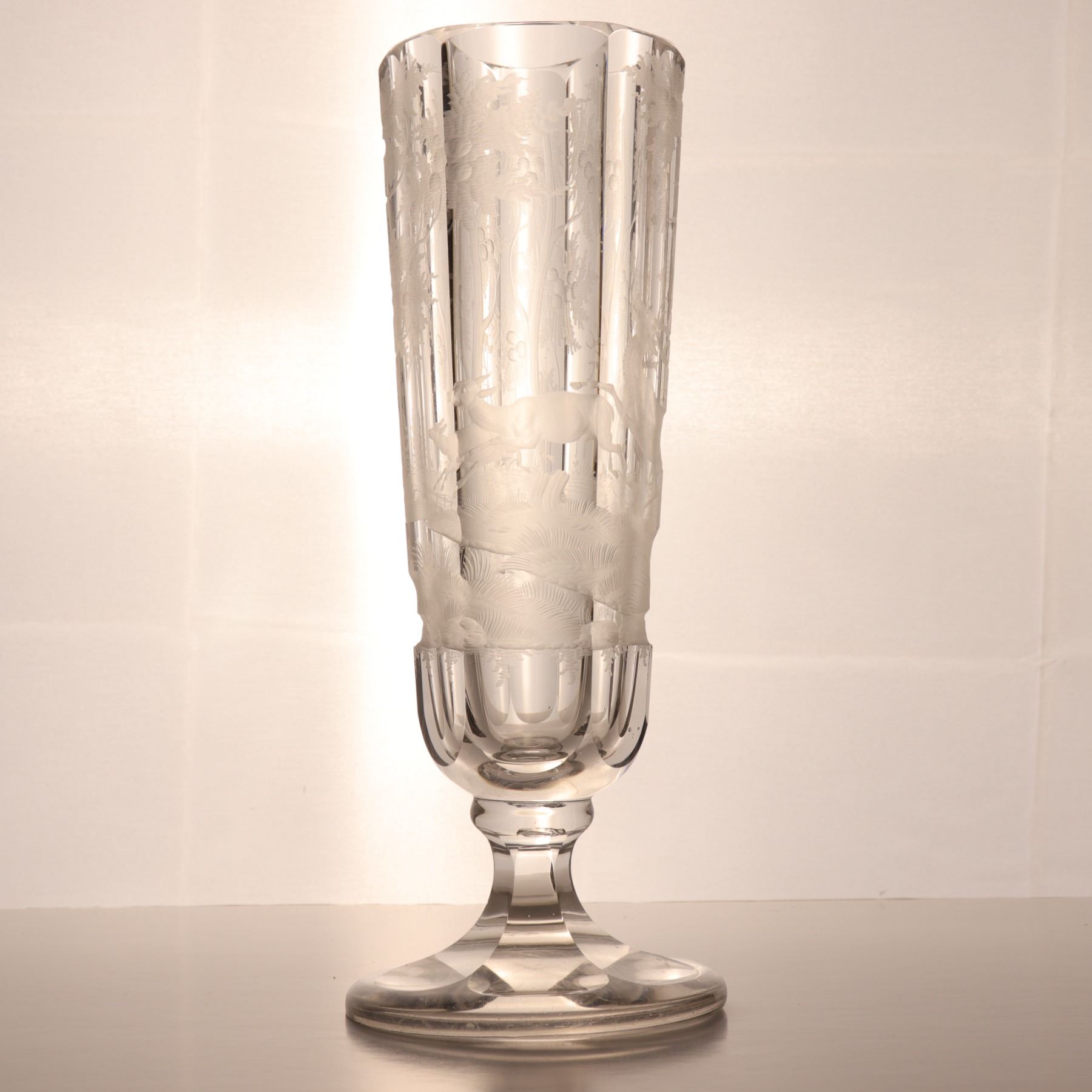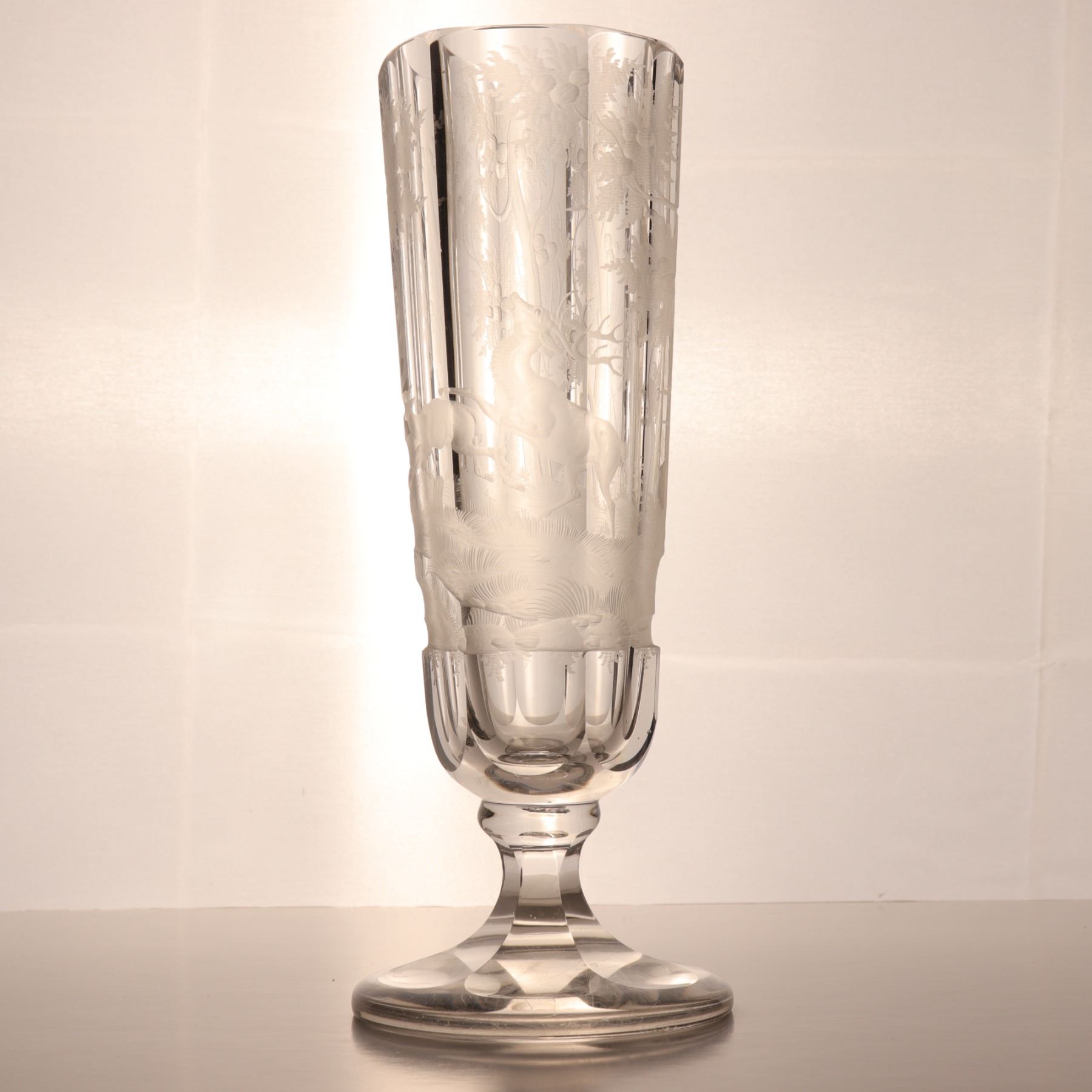 Tall wheel-engraved clear glass vase on a stepped foot, decorated with wild life in landscape. The cylindrical body is panelled and acid-softened in appearance, with the engraved scene wrapping around the vessel. Decorative 20th century art glass, sold as a single display piece. Chip to the rim.