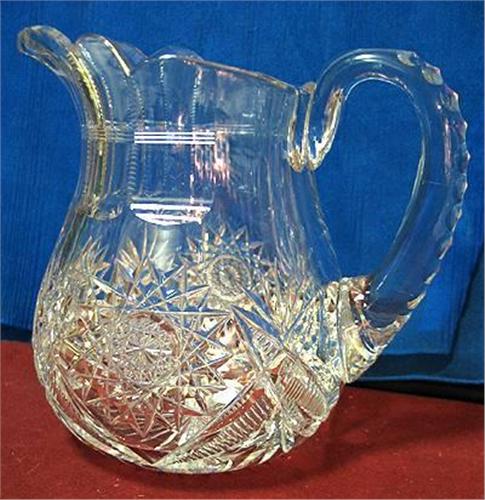 Wheel cut crystal pitcher standing 7" tall. Designs are sharp to the touch. Some flaking to the rim. No cracks