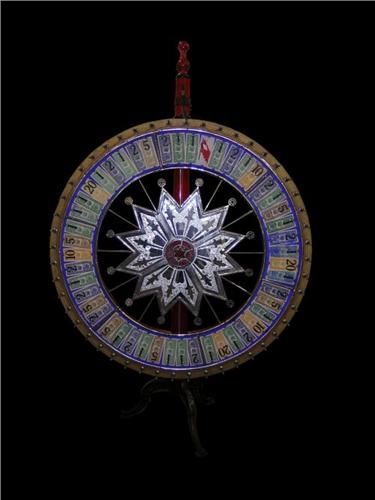 Wheel of Fortune c. 1890 54" diameter. From a Saloon in Sutter Creek Calif. Wheel was probably made by Noll & Co. The outer rim is laid out with different denominations of phony money. This design is rarely seen.