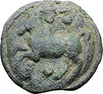 Wheel series. Triens, about 265-242 BC. Obv. Horse prancing left; four pellets across field. Rev. Wheel of six spokes, within four pellets. Cr. 24/5. TV 33. AE. g. 100.40 mm. 46.00 R. VF. Rare. Actractive green patina. Repubblica Romana. Cr. 24/5. TV 33. AE. g. 100.40 mm. 46.00 R.
