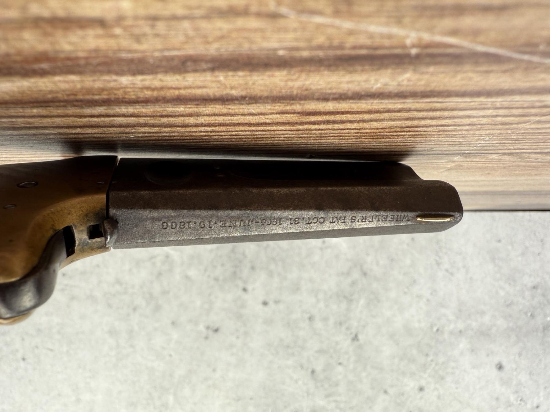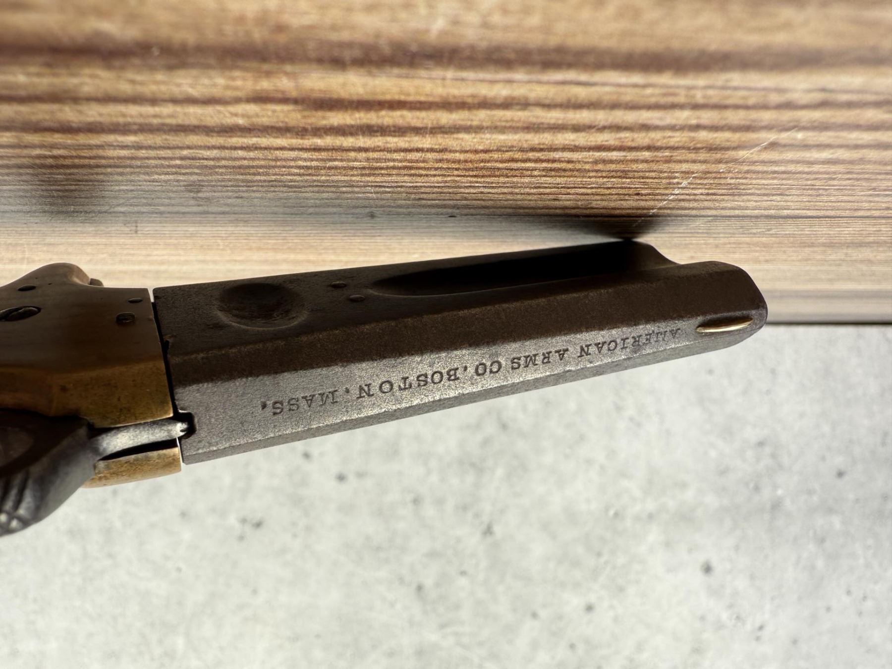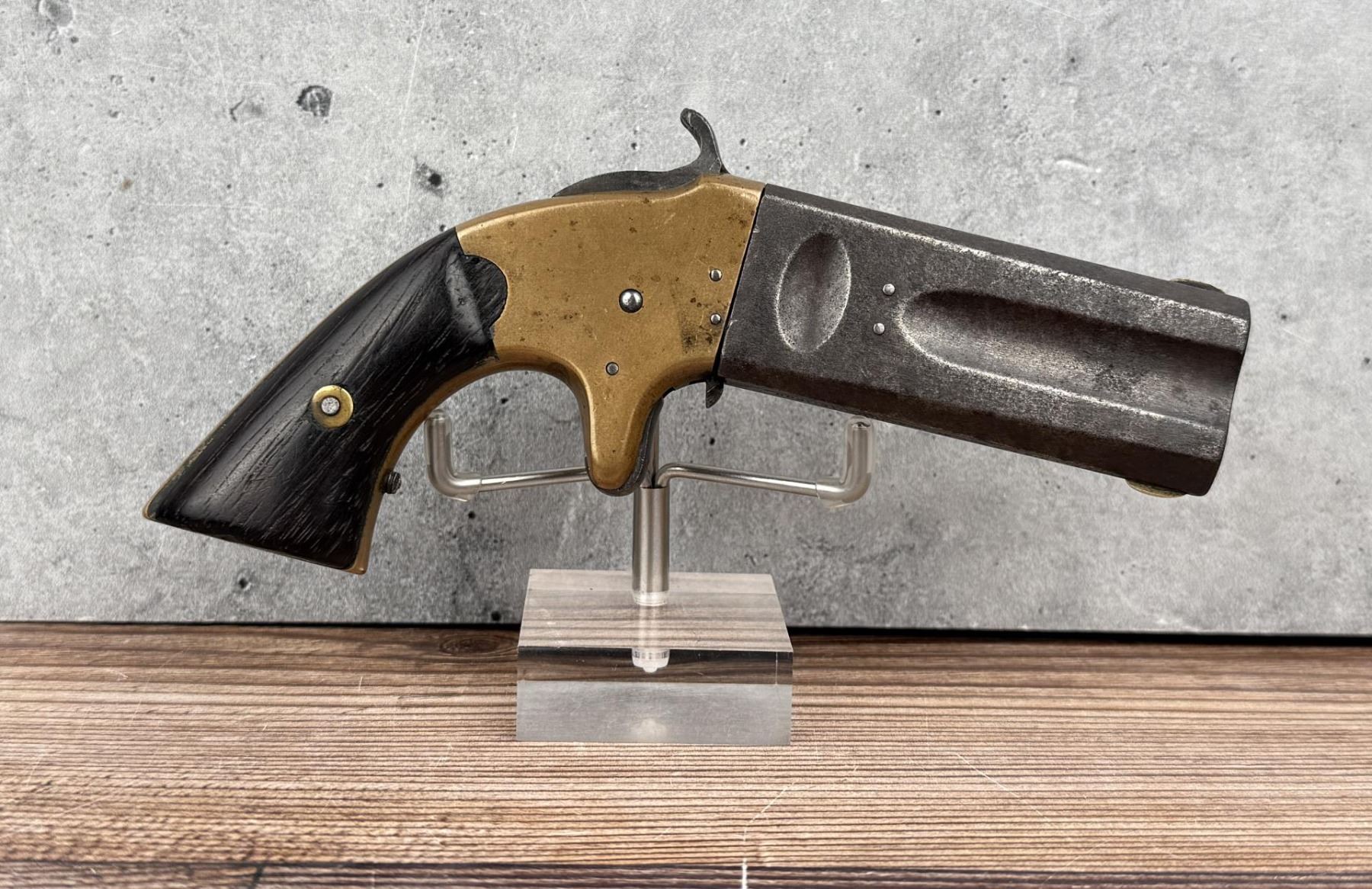 American Arms Over & Under Double Barrel Derringer. .22RF & .32RF. 2.875" barrels. SN: 3435. Brown patina to steel components with brass frame mounting varnished rosewood grips and German Silver front blade sights to both barrels. Hand indexed two-shot Derringer pistol with single action hammer and featuring fluted barrels. Marked in a single line over the .32 barrel AMERICAN ARMS CO. BOSTON. MASS, and over the .22 barrel WHEELER'S PAT. OCT. 31. 1865-JUNE, 19. 1866. Antique, does not require FFL transfer. International shipping not allowed.