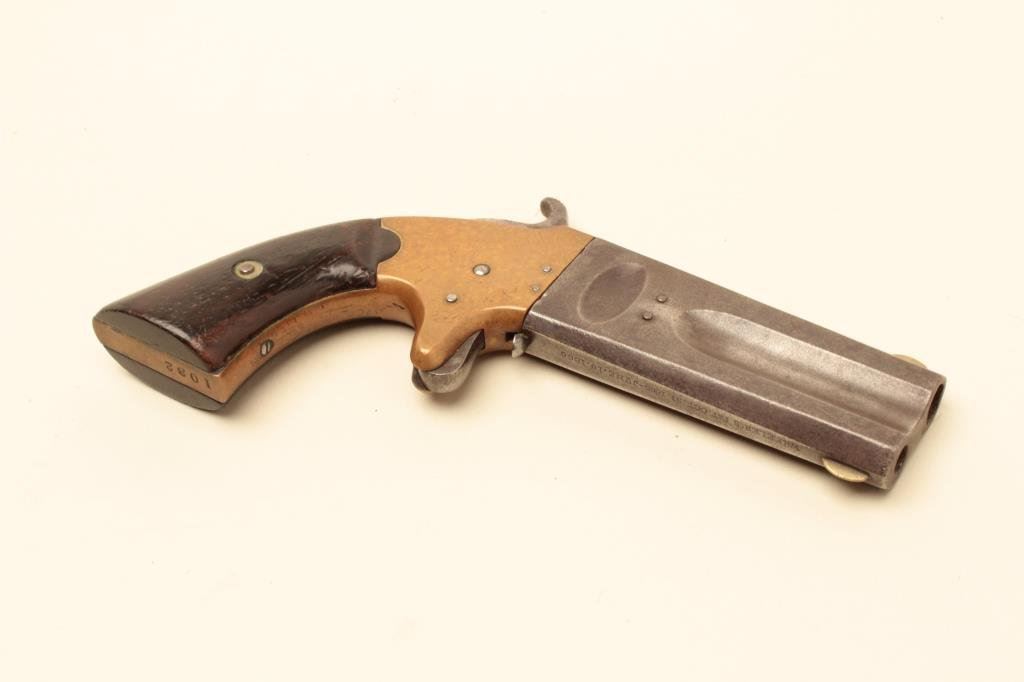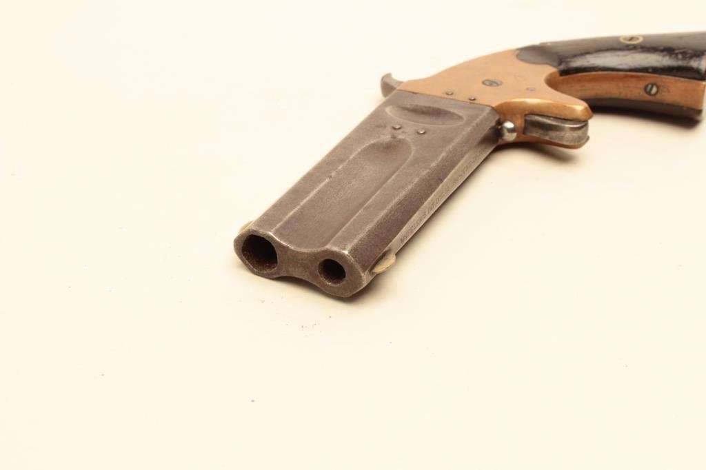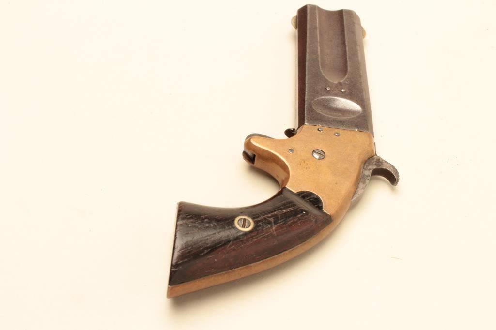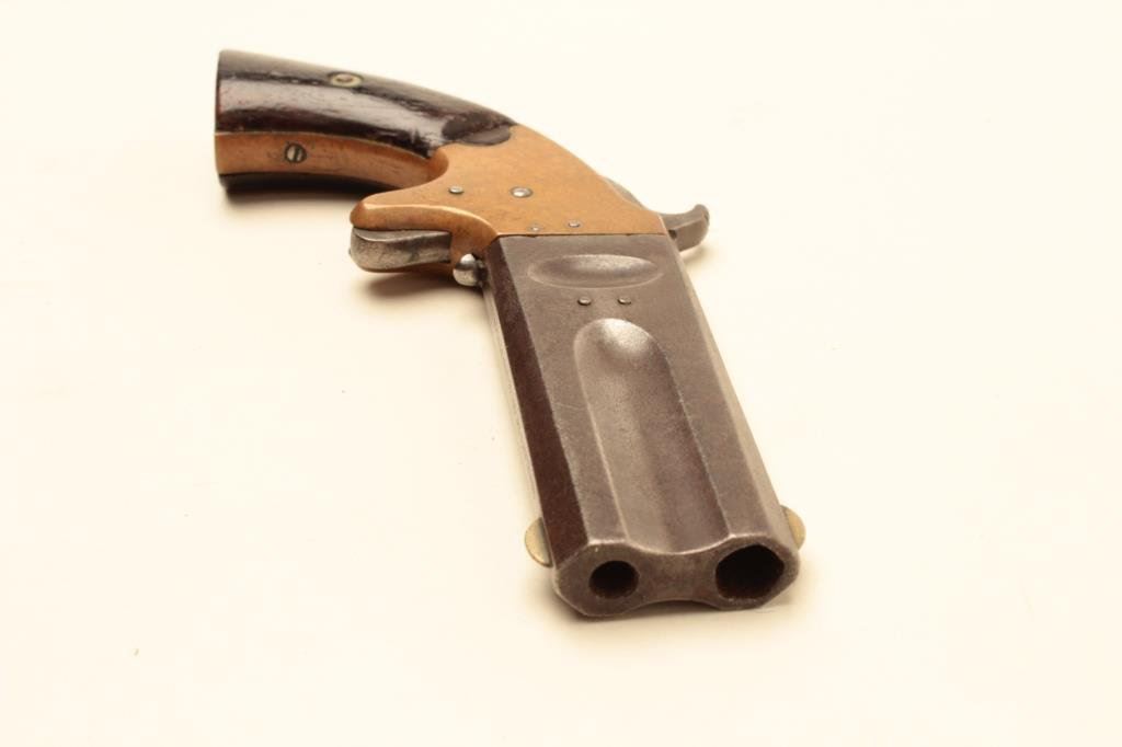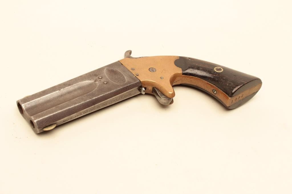 caliber derringer, S/N 1032. Good overall condition with traces of finish in patina and mellow brass uncleaned frame. Good grips, good cation and good overall. (Antique) Est.: $300-$600.
