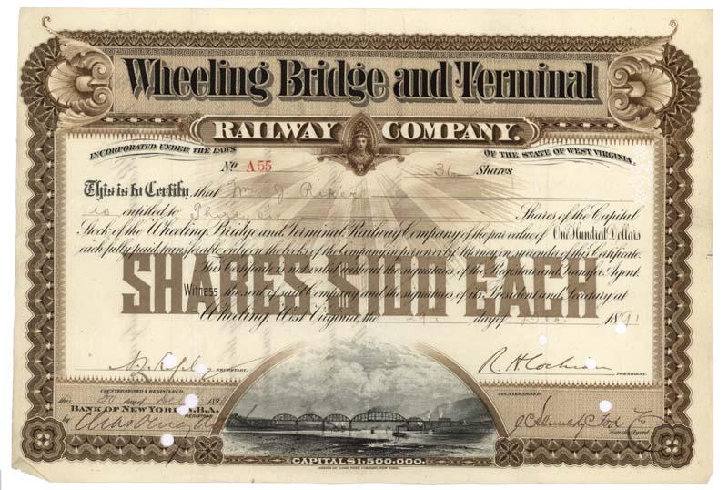 1891, West Virginia. Stock certificate for 36 shares. Brown/Black. Vignette of a bridge spanning the water at bottom center. Punch cancelled and very fine.