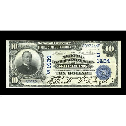 <B>Wheeling, WV</B></I> - $10 1902 Plain Back Fr. 624 <B>The NB of West Virginia</B></I> Ch. # (S)1424<BR>Here is a great bank title for a state collection. Dark printed signatures of A.E. Schmidt and W.B. Irvine compliment this $10 greatly. <B>Very Fine-Extremely Fine.</B></I>