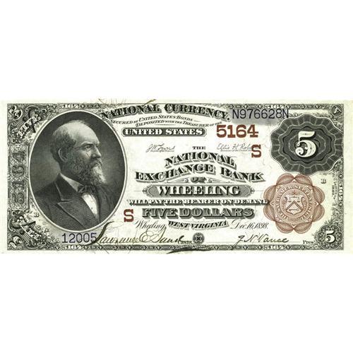 <B>Wheeling, WV</B></I> - $5 1882 Brown Back Fr. 477 <B>The National Exchange Bank</B></I> Ch. # (S)5164<BR>A bright and well centered example. There are a couple of stray pinholes and a small tape repair on the reverse covering a tiny area of ink erosion in the bottom margin, all of which sounds considerably worse than they appear. <B>About Uncirculated.</B></I>