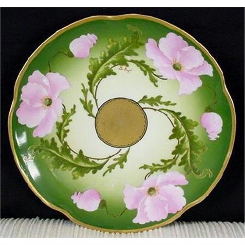 Gorgeous hand painted plate decorated with poppies by the Wheelock Pottery of Peoria, Illinois. Wheelock began making pottery in 1888, and later moved into importing china. This beautiful piece measures 8 3/4" across its scalloped edge. The condition is very good-to-excellent, with just some minor wear to the hand painted finish and gold trim, as shown in the closeup photo. Signed by the artist, DeCroft. In addition to the Wheelock stamp, the piece is also stamped with the Bavarian manufacturer's mark, identified as Jaeger & Company, circa 1902.