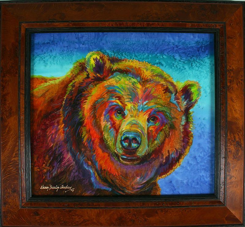 Artist: Nancy Dunlop Cawdrey. Title: When Bear Wears Turquoise. Medium: Dye on Silk. Artwork size: 16" x 18". Framed size: 20" x 22".