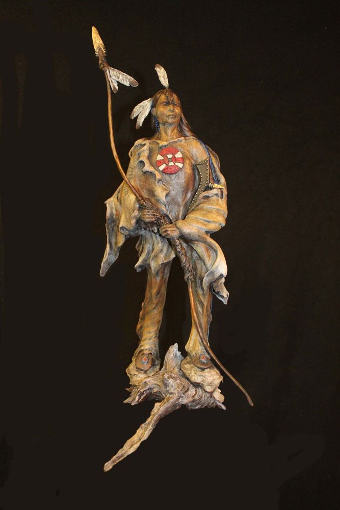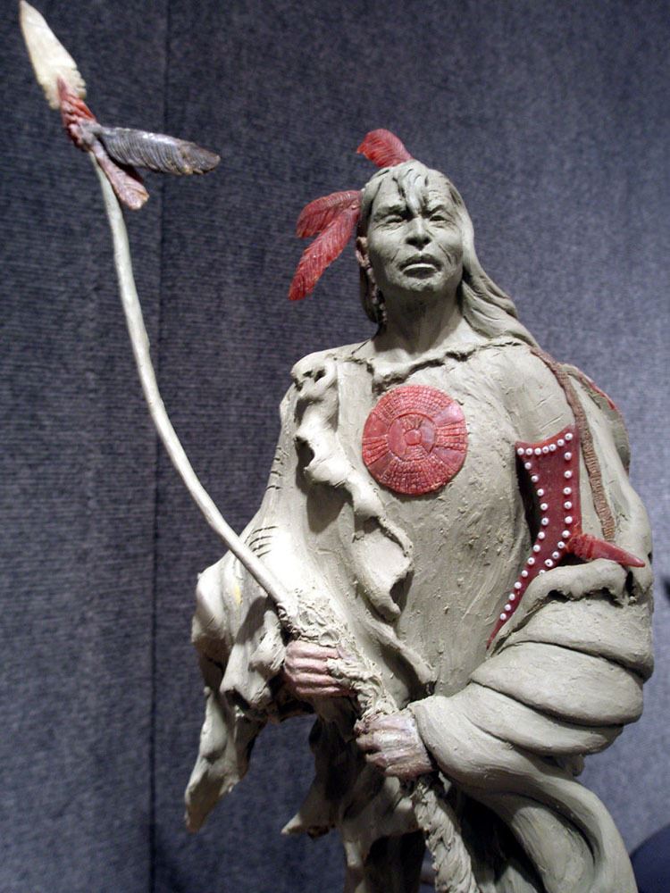 Artist: Jerry McKellar. Title: When Buffalo Roamed. Size: approximately 24"high. Medium: Bronze, edition of 16. Description: This warrior is a "complimentary" piece to my mountain man bronze, "When Wealth Was Pelts". Presently I only have photos in the "clay" stage, but will send better photos after I get the finished piece from the foundry in July.