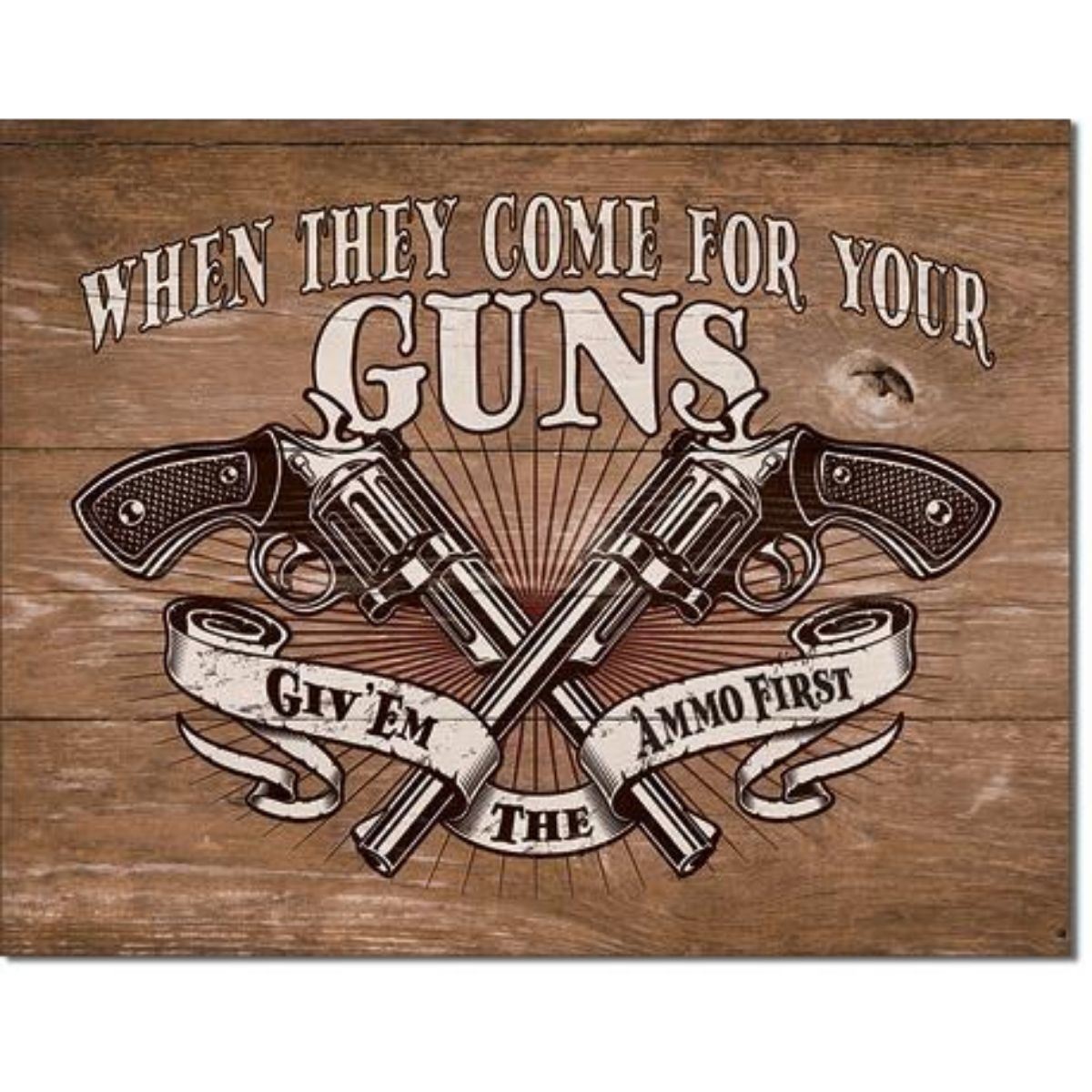 "When They Come For Your Guns, Giv' Em The Ammo First" metal pub bar sign. 12 1/2" X 16" with pre-drilled holes for mounting.Â