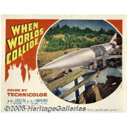 <B>When Worlds Collide (Paramount, 1951)</B></I> Lobby Card (11" X 14"). "Waste everything except time. Time is your most valuable commodity". This was the watchword for the scientists and engineers working feverishly to finish the Space Ark that would take forty people to a new planet home, before the Earth is destroyed by a rogue star. George Pal, the producer of "Destination Moon", "The War of the Worlds" and "The Time Machine", has one of his greatest triumphs with this tale of how the best and worst in humanity comes out when the world is coming to an end. The great sci-fi artist Chesley Bonestell designed the spaceship seen in this scene card. Pinholes, small corner creases, light wrinkles, a one-inch edge tear and very minor soiling. Very Fine.