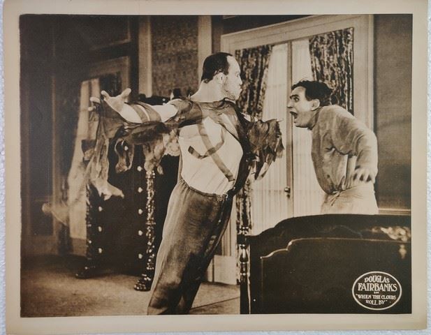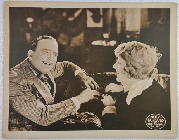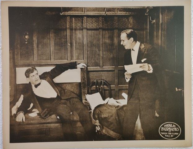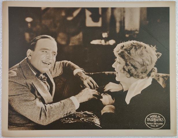 When the Clouds Roll By (Douglas Fairbanks, 1919) lobby card. Starring Douglas Fairbanks, Albert MacQuarrie, Kathleen Clifford, Frank Campeau, Ralph Lewis, Herbert Grimwood, Daisy Jefferson. Directed by Victor Fleming & Theodore Reed. Minor edge wear, minor creases, some tears. Very Fine. (11"x14").