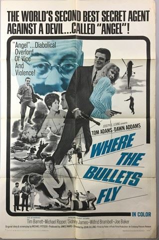 Where the Bullets Fly (Alastair Films, Puck Films; 1966) poster. Comedy, Spy Film, Parody. Starring Tom Adams, Dawn Addams, Tim Barrett, Michael Ripper, Sid James, Wilfrid Brambell, Joe Baker, John Arnatt, Ronald Leigh-Hunt, Marcus Hammond. Directed by John Gilling. Some edge wear, creases, paper loss. Very Fine. (27"x41").