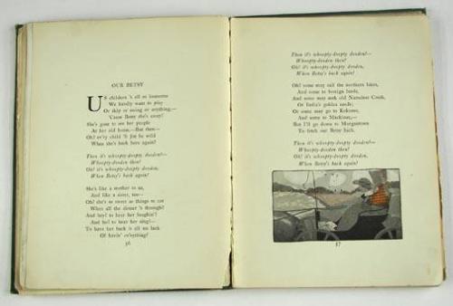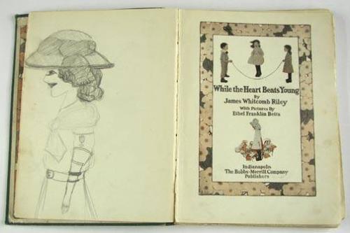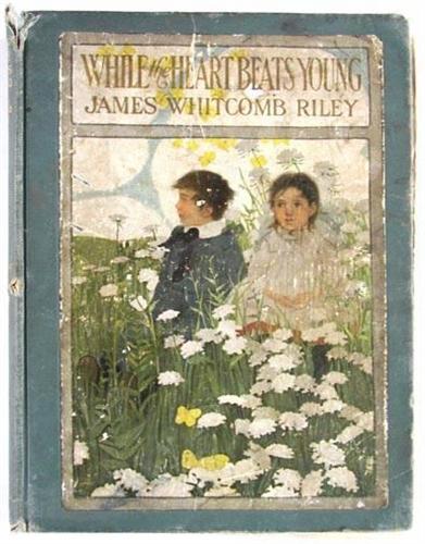 While The Heart Beats Young, by James Whitcomb Riley, illustrated by Ethel Franklin Betts, published by The Bobbs-Merrill Company of Indianapolis, 1906, from the Estate of Charles Ragland Bunnell, Condition: Poor, cover worn including tear to the spine, pages are loose & in many cases detached, child has drawn & written on several pages, no dust jacket