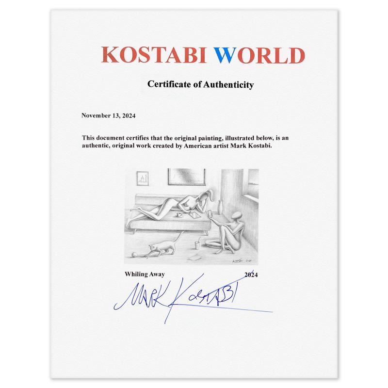 "Whiling Away - New York" is an original drawing on paper by Mark Kostabi, hand signed by the artist. This piece comes custom framed. Includes Certificate of Authenticity. Measures approx. 15" x 18" (frame), 9" x 12" (image). This item requires special handling and may have a longer than usual turnaround.