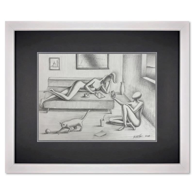 "Whiling Away - New York" is an original drawing on paper by Mark Kostabi, hand signed by the artist. This piece comes custom framed. Includes Certificate of Authenticity. Measures approx. 15" x 18" (frame), 9" x 12" (image). This item requires special handling and may have a longer than usual turnaround.