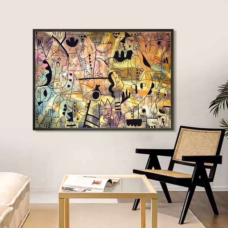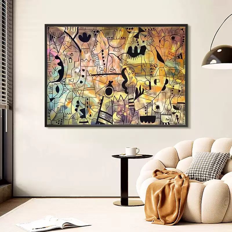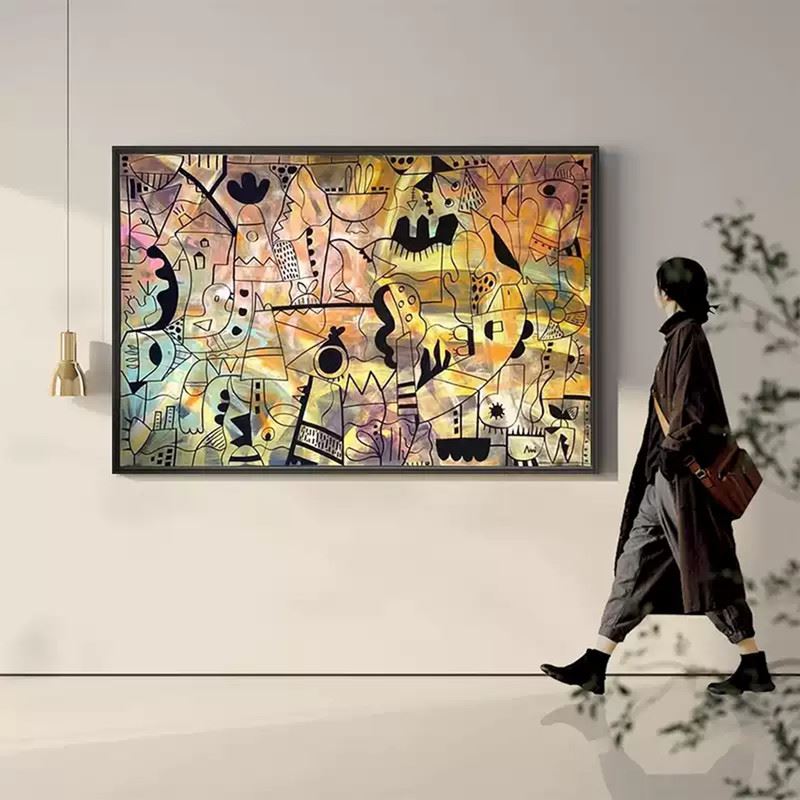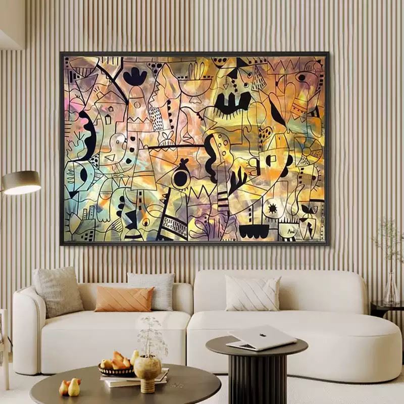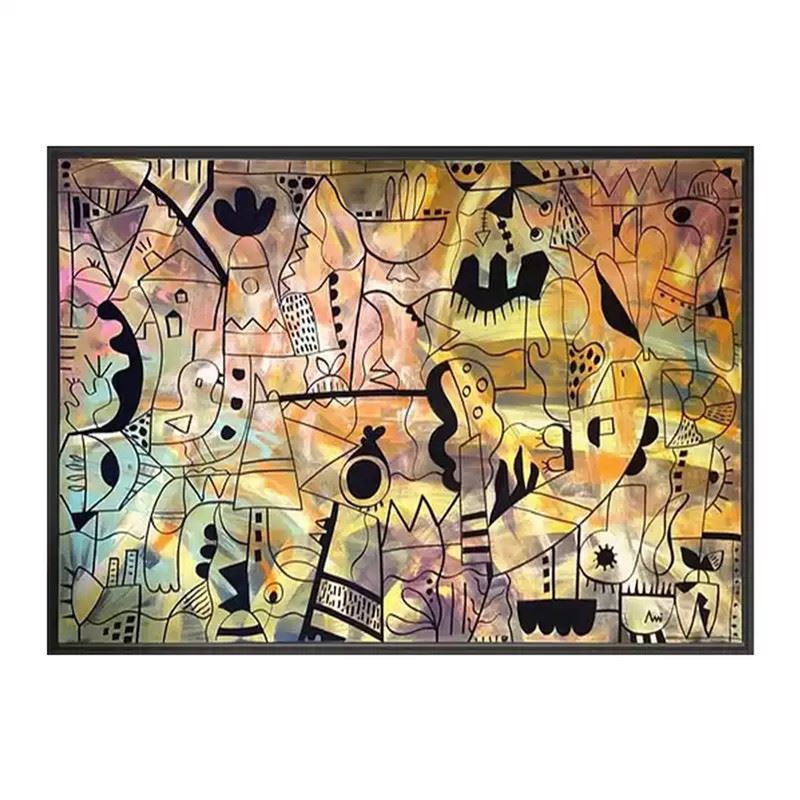 This artwork uses vibrant geometric shapes and bold colors to create an abstract visual impact. The strong contrasts and dynamic lines intertwine, conveying a sense of psychedelic freedom, as if entering a colorful dreamscape. Dimensions: 24 x 31 inches.