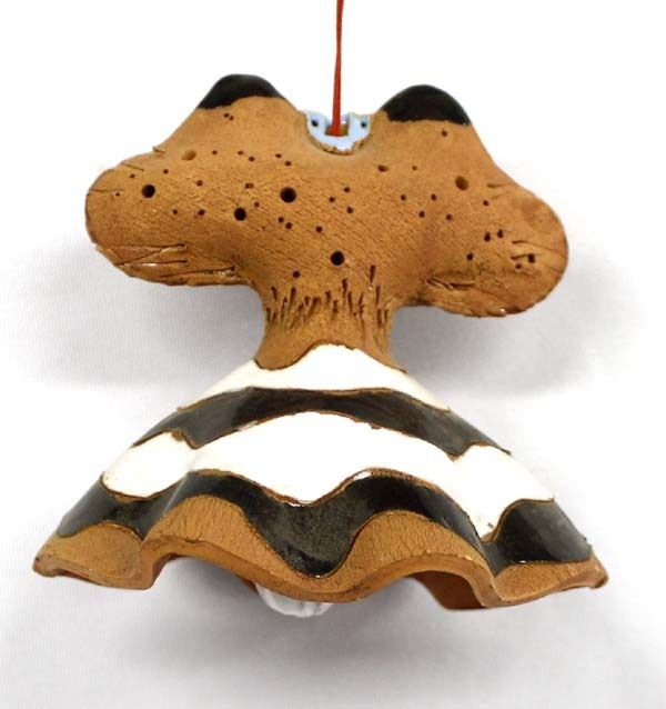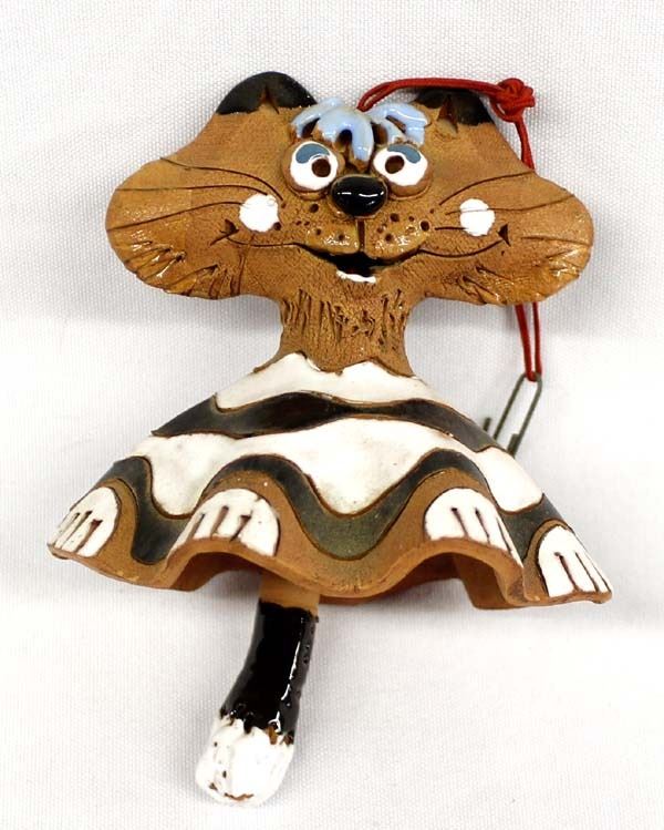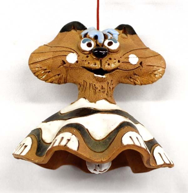 Whimsical Glazed Pottery Cat Bell, measures 5.25''L x 3.75''W x 3.5''Deep, clapper is cat's tail
