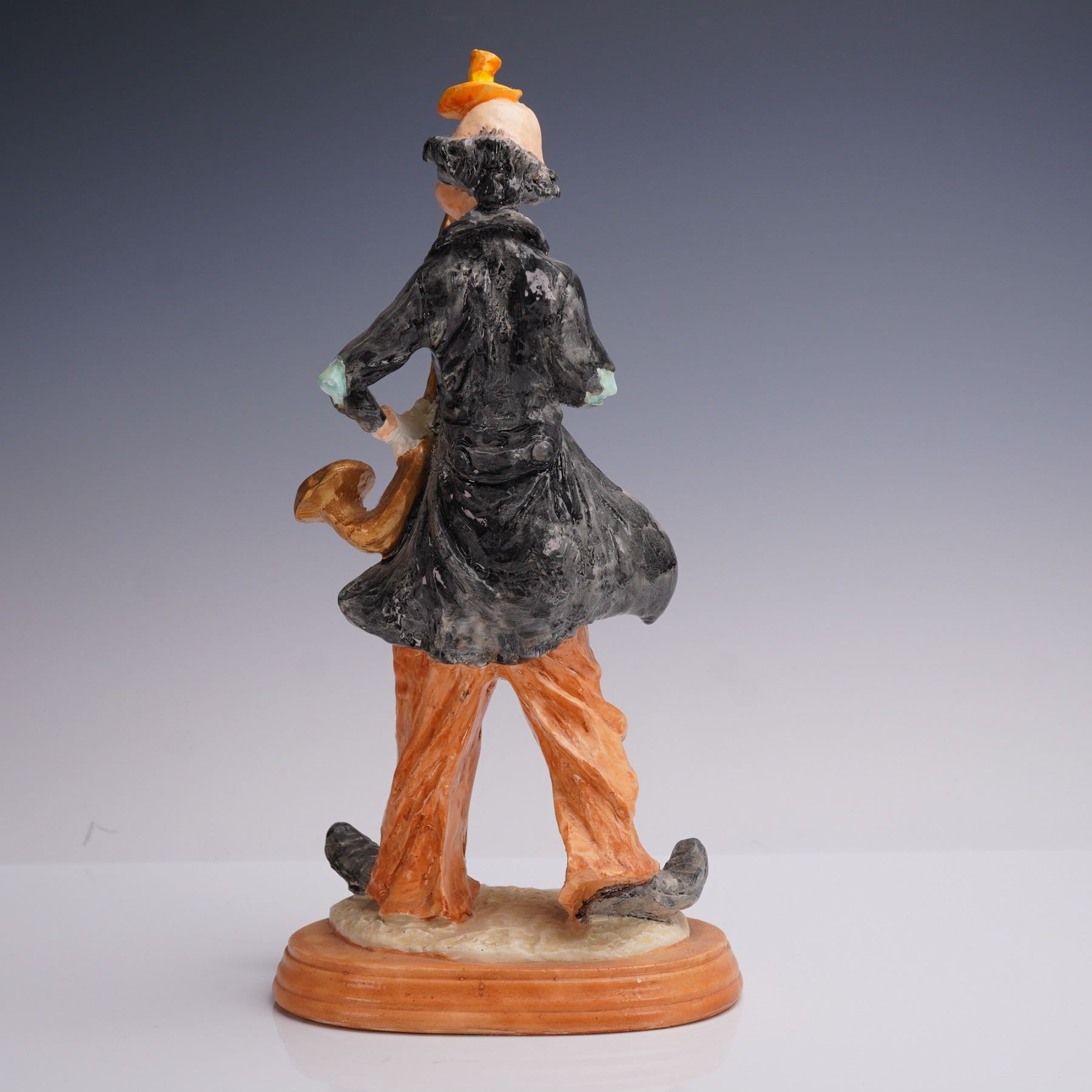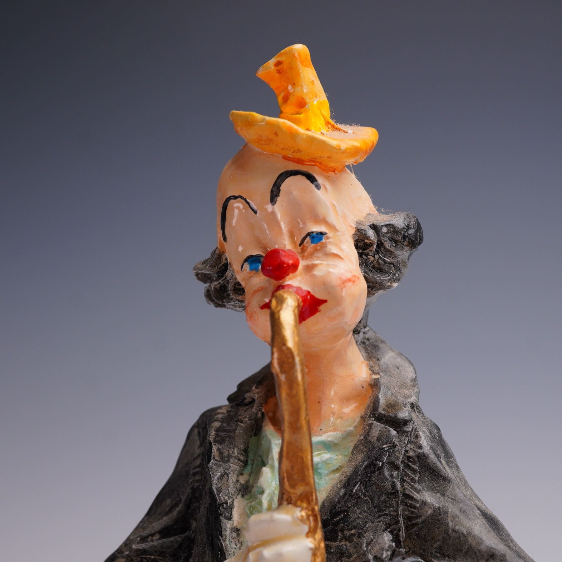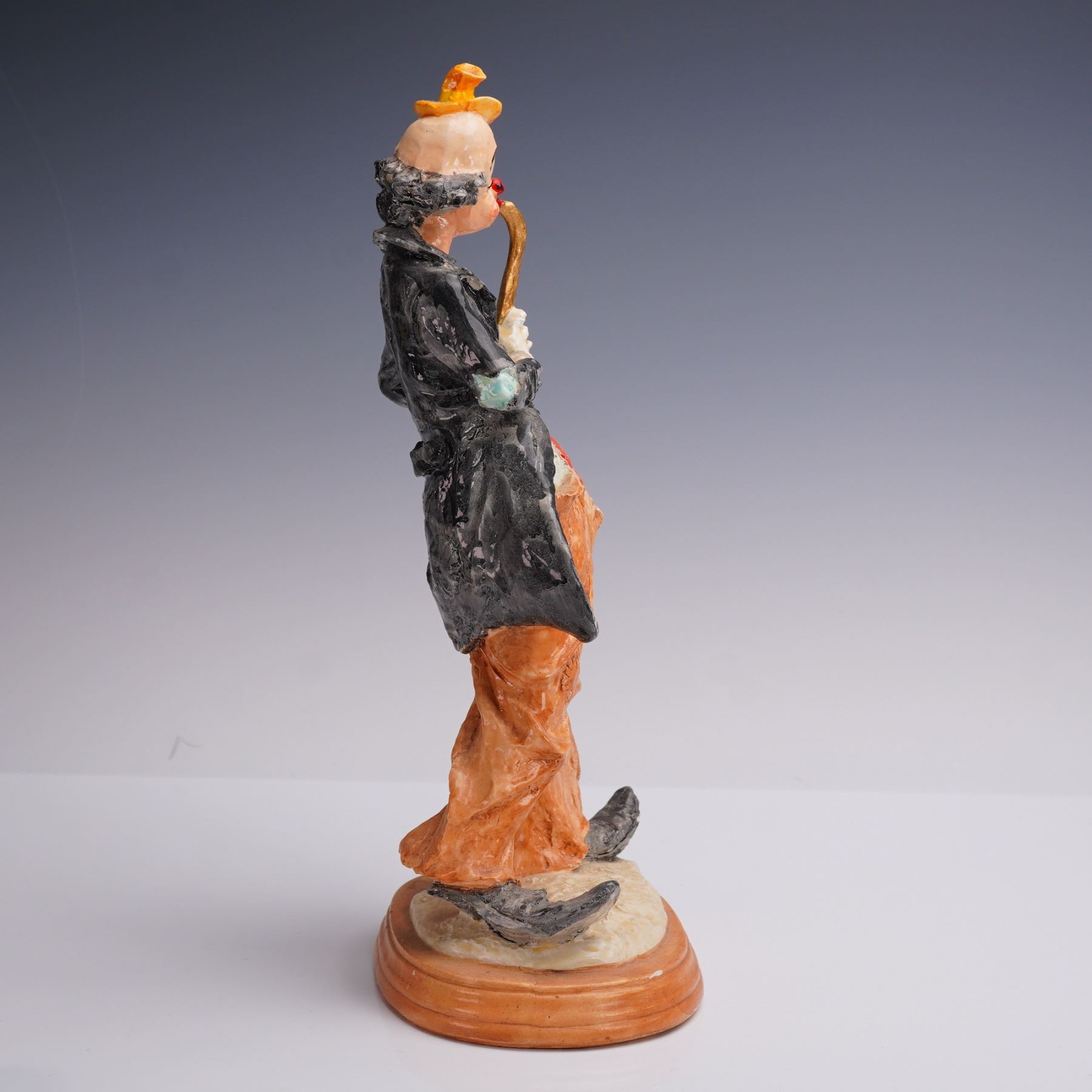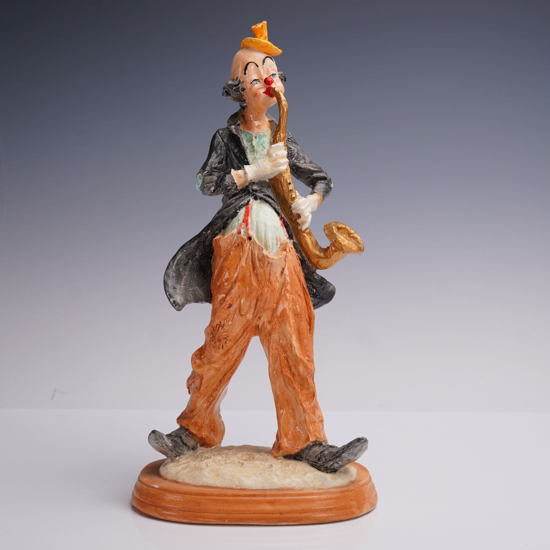 A hand-painted porcelain clown figurine modeled in a humorous stance playing a saxophone. The clown is dressed in exaggerated orange trousers, a black tailcoat, and yellow hat, with expressive facial features and painted details emphasizing a playful, vintage circus aesthetic. Finished in a glossy glaze and mounted on an oval ceramic base with felt pads.