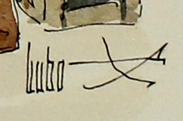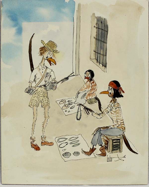 Whimsical Original Watercolor Painting of Native American Artisans at the Palace of the Governors on the Santa Fe Plaza, signed and measures 8'' x 10''