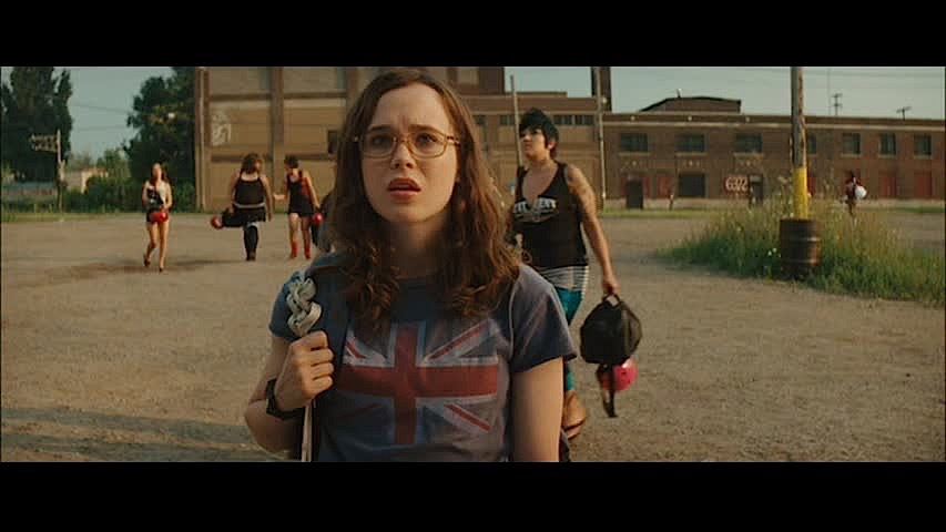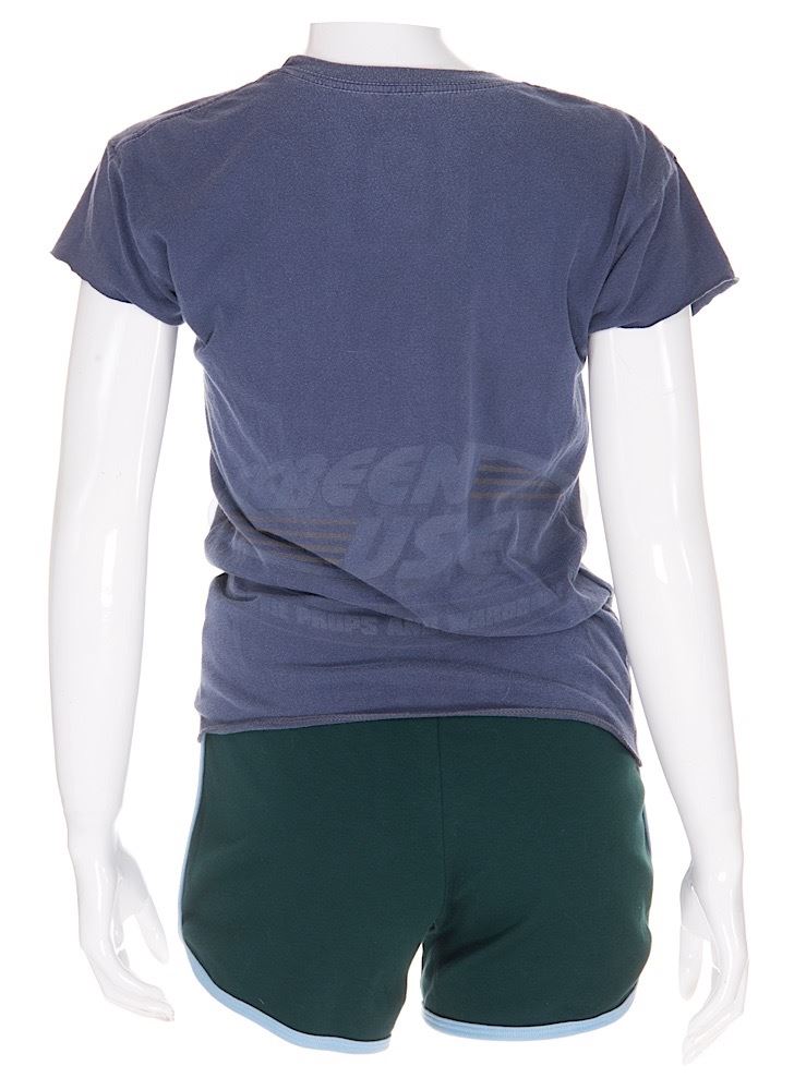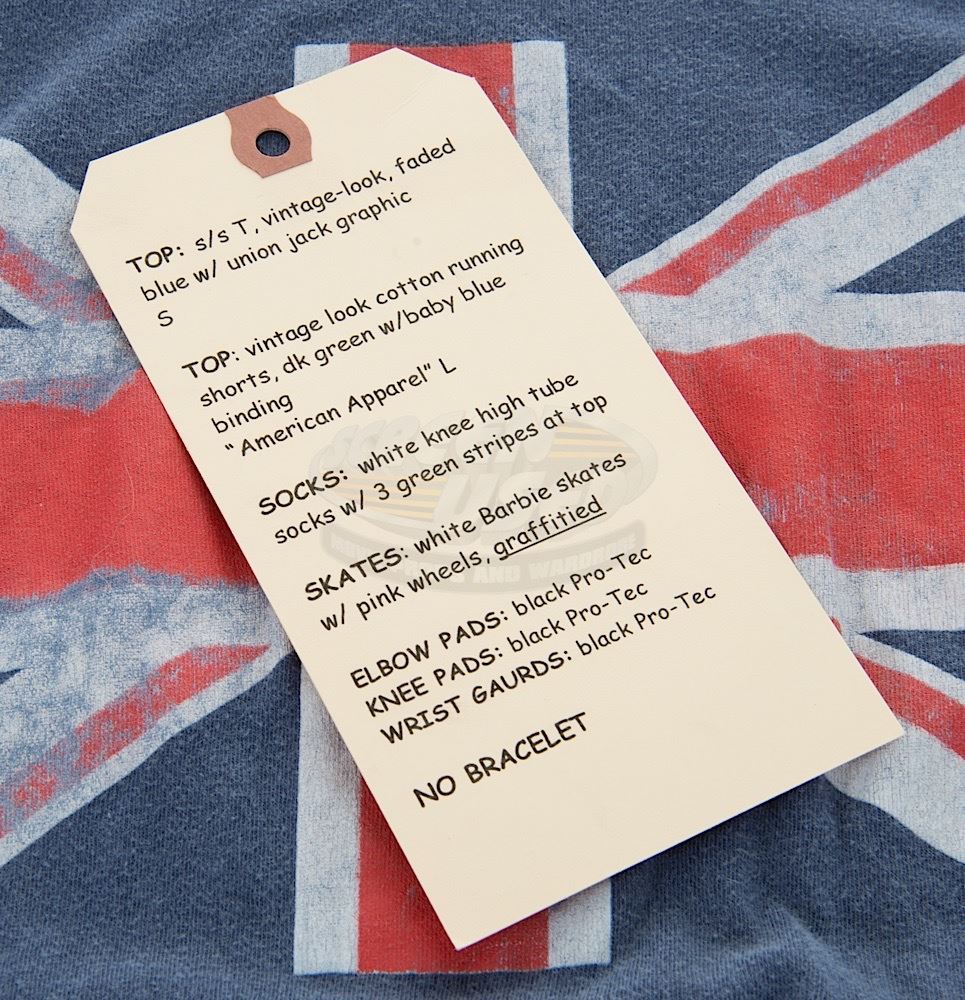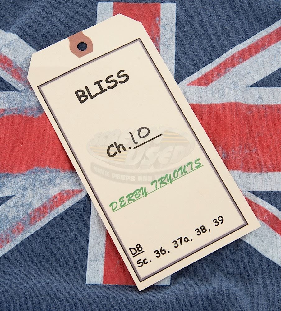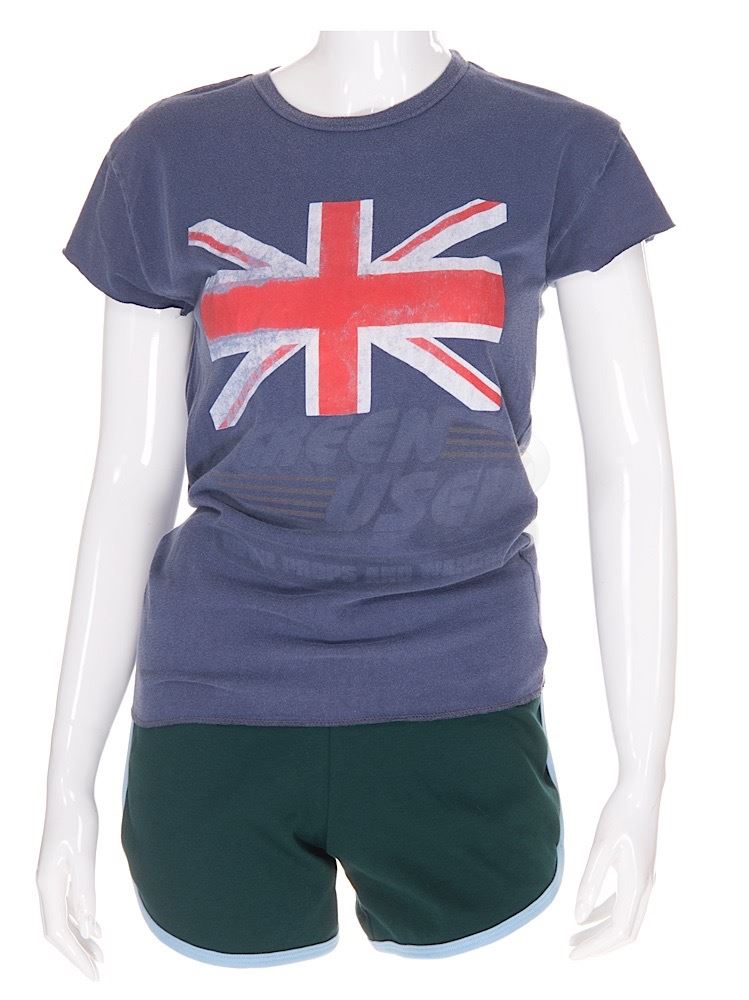 (Mandate Pictures, 2009) This outfit was acquired by the production for use by Ellen Page as "Bliss Cavendar". The outfit consists of a size small short sleeve t-shirt with a weathered Union Jack graphic on the chest and a size X-large pair of green running shorts with baby blue trim. Included with the outfit is a production used costume tag that details the entire costume, change and scene numbers used.