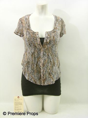 Bliss (Ellen Page) thin pink and black s/s button down scoop neck "Kimchi Blue" shirt (size XS), black waffle knit scoop neck sleeveless "Sparkle & Fade" tank (size S) (Screen worn/includes wardrobe tag)