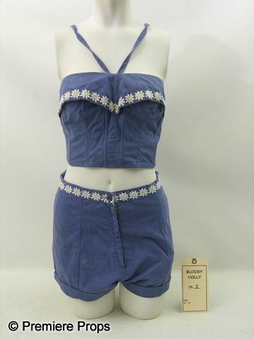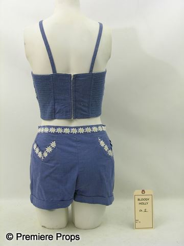 Bloody Holly (Zoe Bell) light blue Vintage playsuit bodice w/v-neck straps, med blue cotton boned sweatheart daisy embroidered neck line detail "Queen Casuals" top (13-14), matching blue playsuit zip up "Queen Casuals" shorts (Size 18) (Screen worn/includes wardrobe tag)