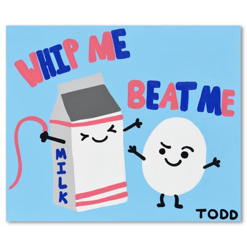 "Whip Me, Beat Me" is an original acrylic painting on gallery wrapped canvas by Todd Goldman, hand signed by the artist. Includes Letter of Authenticity. Measures approx. 60" x 48" (image). Due to the way this piece was stored there may be minor wear or signs of age (such as wear on the corners) but the piece is in overall good condition.