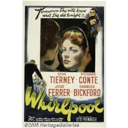 <B>Whirlpool (20th Century Fox, 1949)</B></I> One Sheet (27" X 41"). This psychological melodrama stars Gene Tierney as a woman tormented by her compulsive kleptomania. She secretly seeks the help of a devious hypnotist (José Ferrer) who tricks her into taking the rap for a murder he committed. Her psychiatrist husband (Robert Conte), believes in her innocence and begins to unravel the mystery. There is fold line wear with a touch more at the crossfolds, paper loss on the upper right corner, and nicks, chips, small tears and creases in the borders. The poster has been professionally restored, greatly minimizing these defects. Fine/Very Fine on Linen.