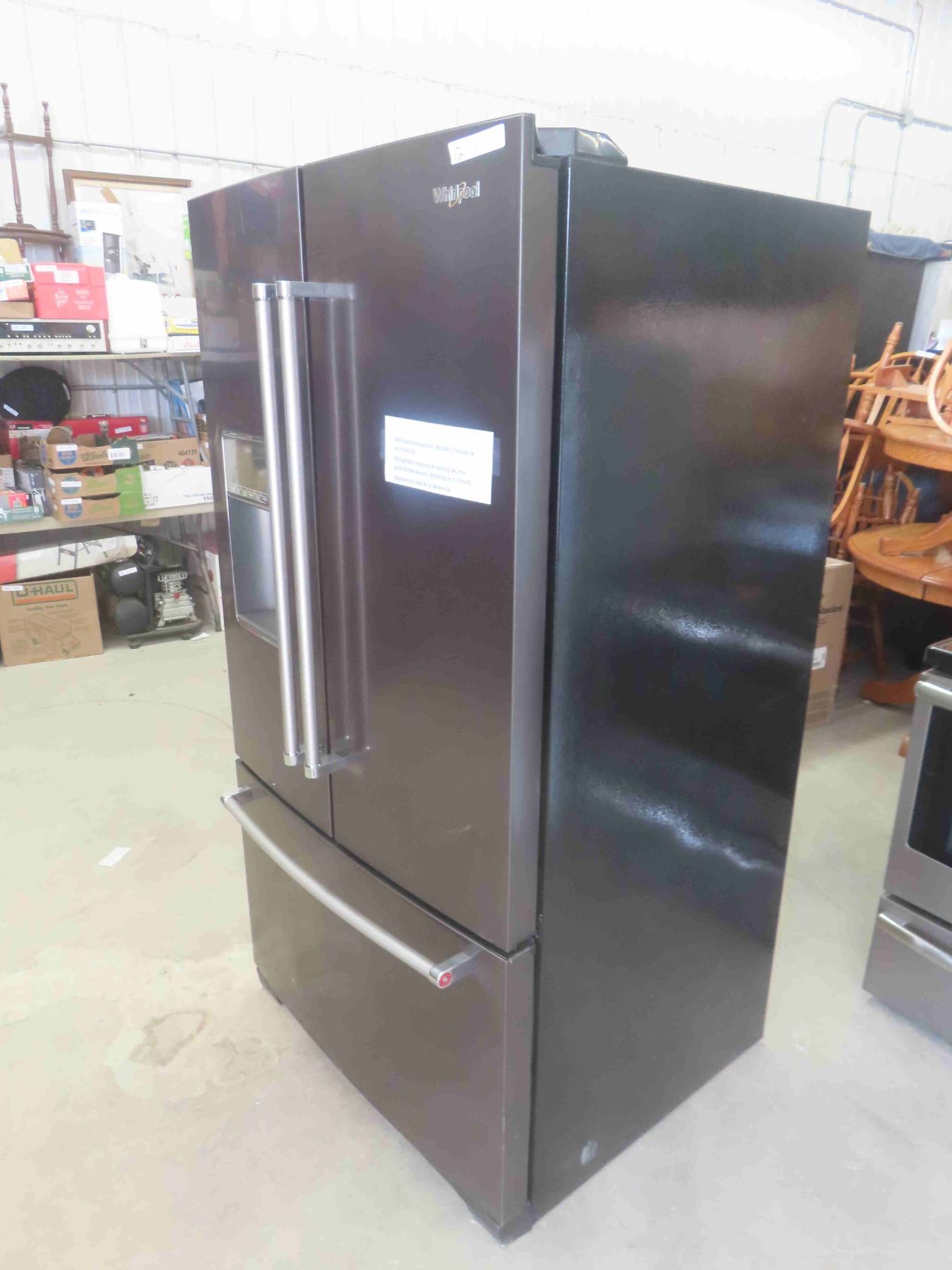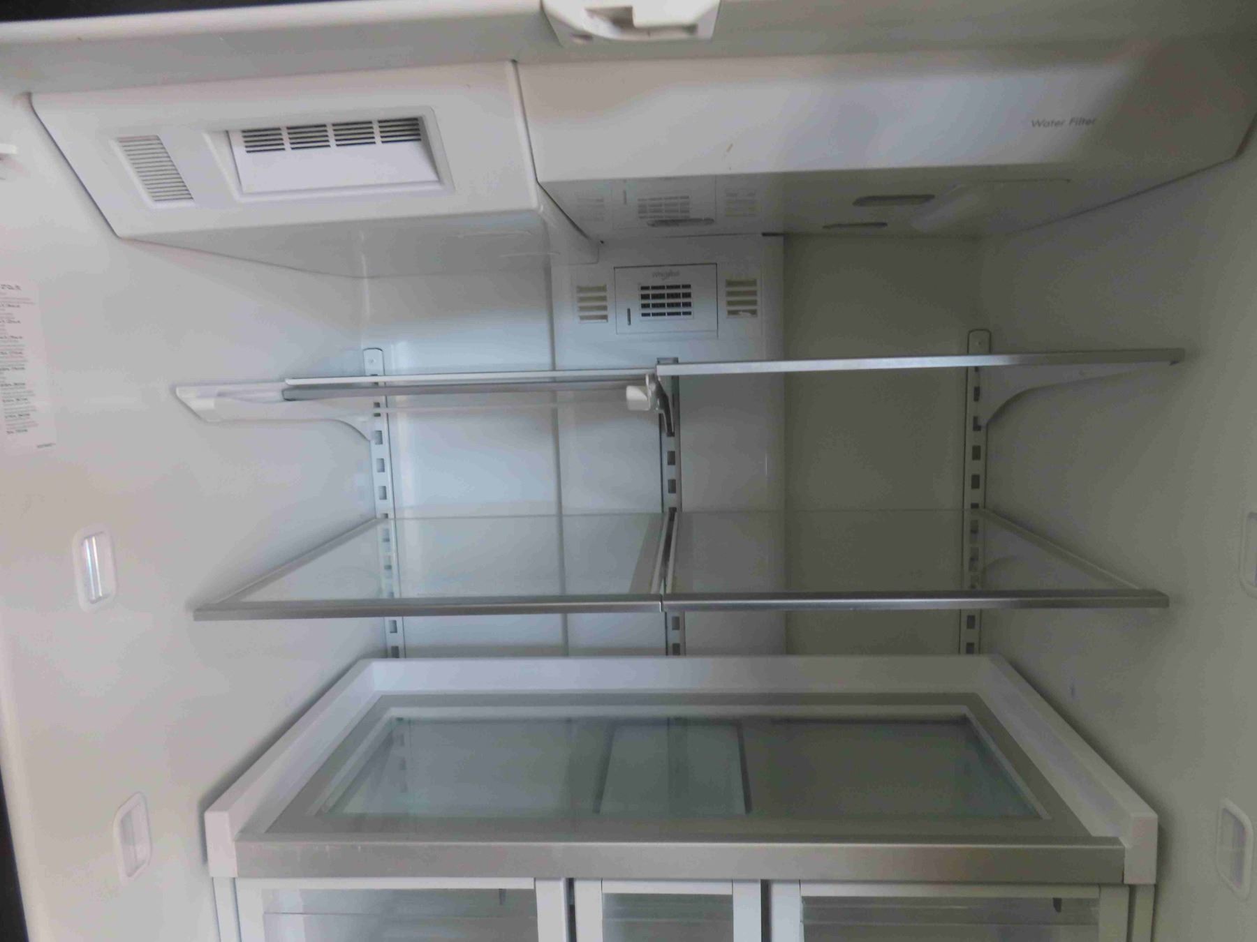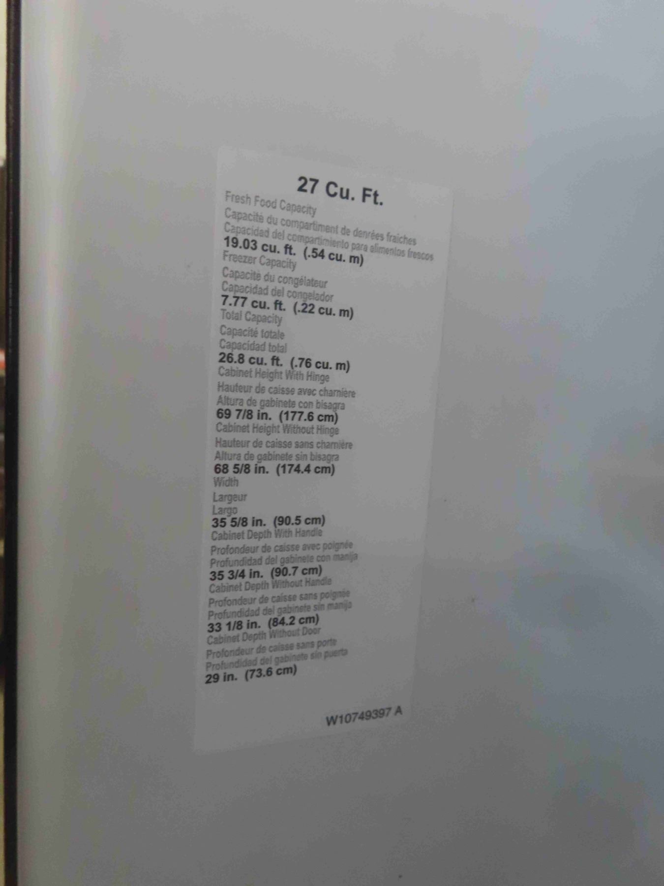 Whirlpool Side by Side Fridge with Bottom Freezer 70'' x 36'' x 32'' - Appears New or Like-New , Some Damage. One Dent on Side, Surface Scratch on Front (See Photos)