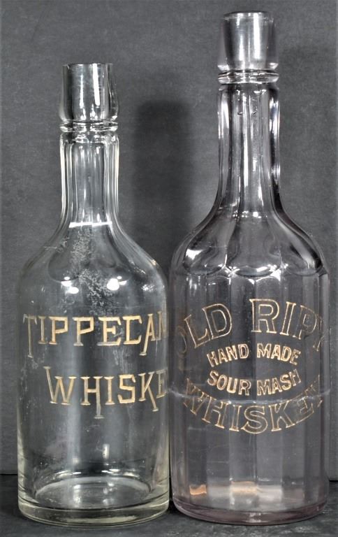 Whiskey Advertising Etched Glass Back Bar Bottles. Old Ripy Hand Made Sour Mash Whiskey, sun purpled. Tippecanoe Whiskey. 11 1/2 and 10 1/2/ inches tall.