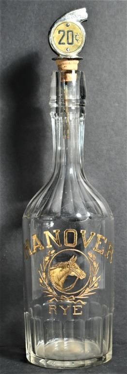 Whiskey Advertising Etched Glass Decanter for Hanover Rye. Etched gold horse head motif. Comes with 20 cent shot stopper. No chips or cracks. 11 1/4 inches tall.